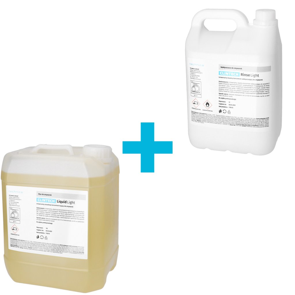 [Sada] umývacích a oplachovacích kvapalín pre komerčné umývačky riadu 10 + 5 litrov | CLINTECH LIGHT
