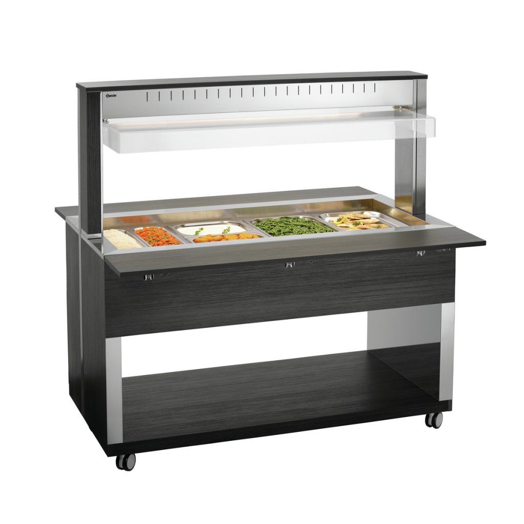Bufetový vozík v moderním dekoru dřeva je vybaven hygienickým krytem a LED osvětlením. Pojme 4 nádoby 1/1 GN a díky vodní lázni pomáhá udržovat servírované pokrmy teplé a vizuálně atraktivní.