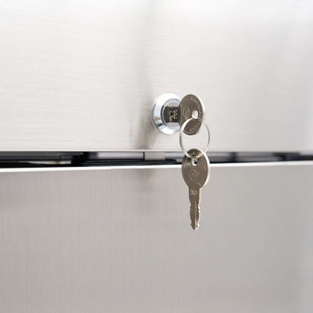 Táto chladnička je vybavená tromi robustnými nastaviteľnými policami (55 x 53 cm), ktoré sú ideálne na uloženie najrôznejších surovín. Súčasťou samozatváracích dverí je antibakteriálne gumové tesnenie a zámok s dvoma kľúčmi pre väčšiu bezpečnosť. Zaoblené vnútorné rohy zabraňujú hromadeniu nečistôt, takže údržba hygieny je jednoduchá. Jednotka je namontovaná na štyroch kolieskach, z toho dvoch s brzdou, takže sa ľahko premiestňuje a je bezpečná, keď je na svojom mieste. LED osvetlenie zaisťuje jasný prehľad o obsahu, akonáhle sa otvoria dvere.