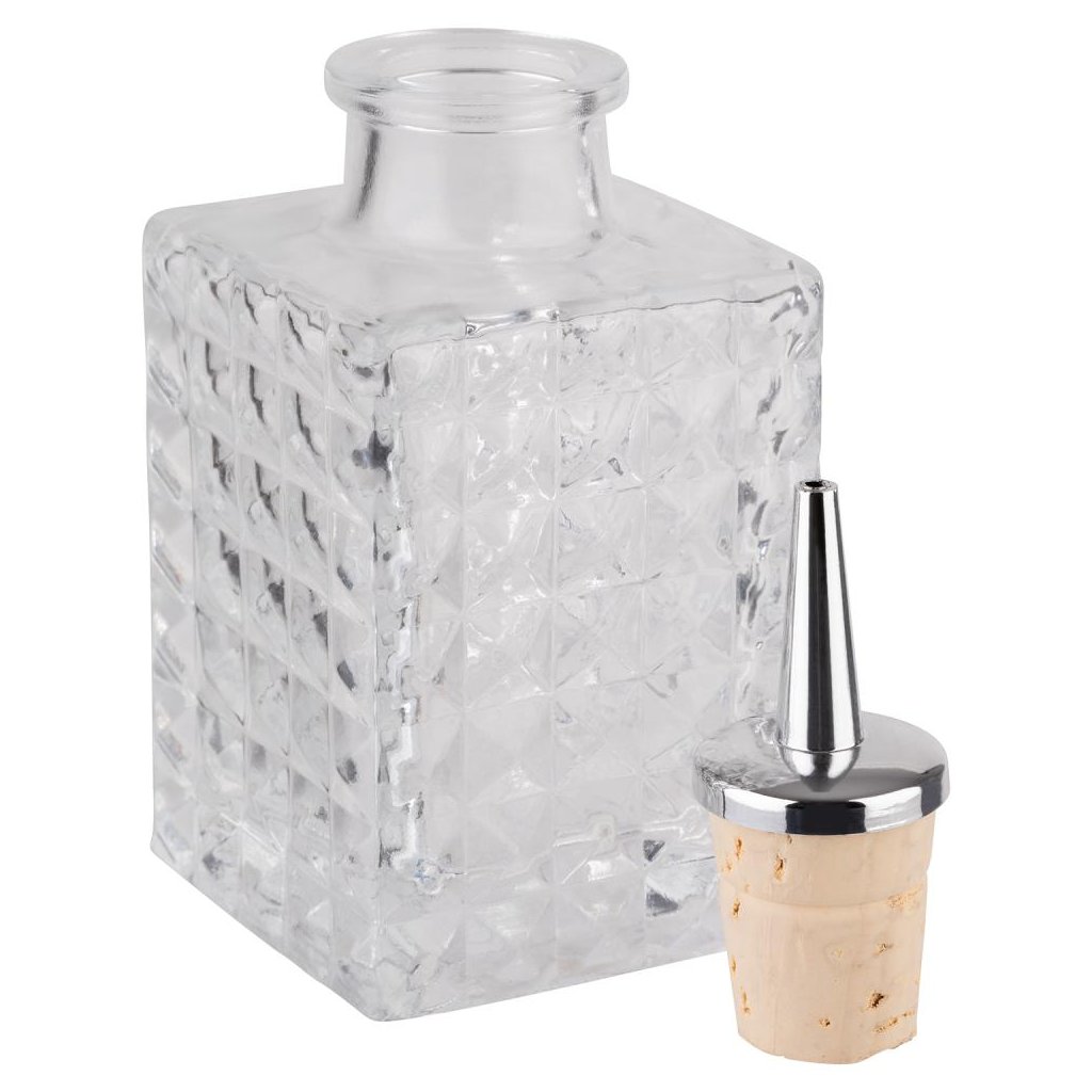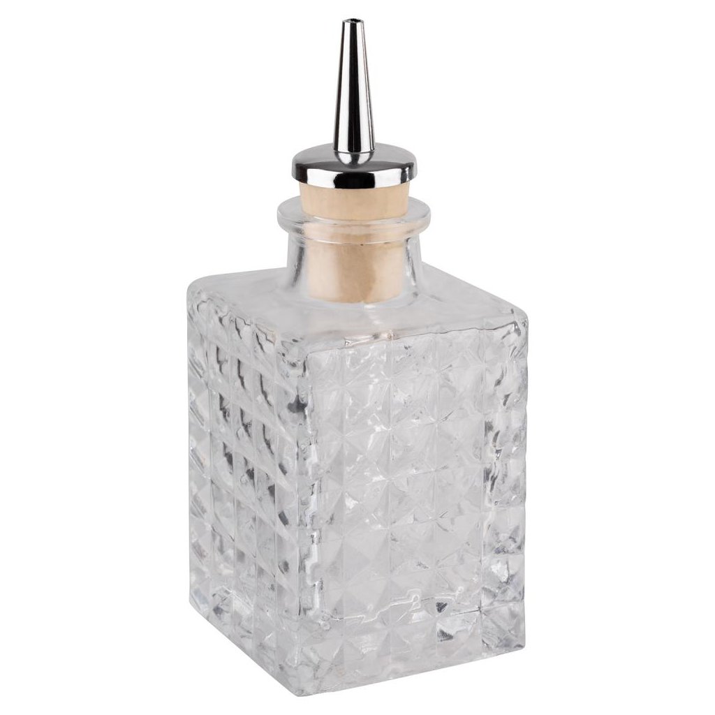 Priehľadná fľaša na ochutenie kokteilu s nálevkou z nehrdzavejúcej ocele.