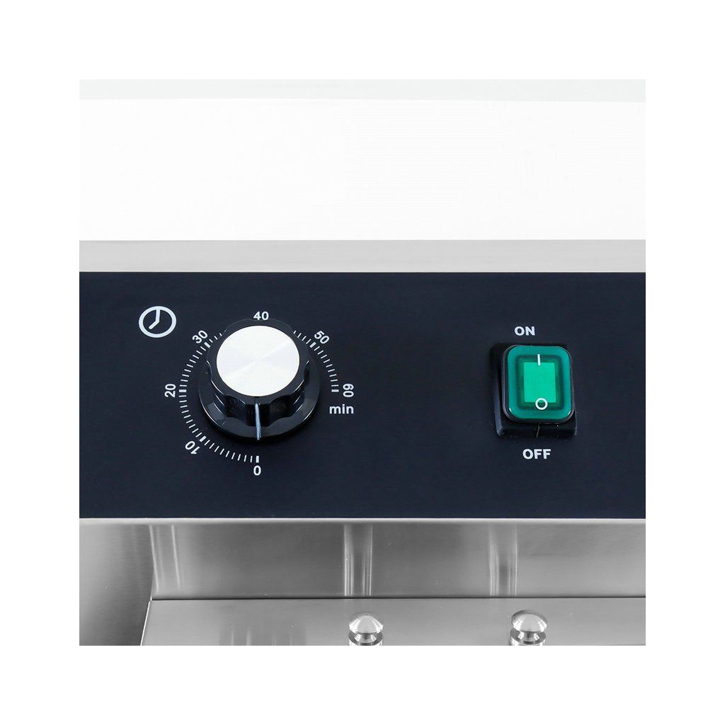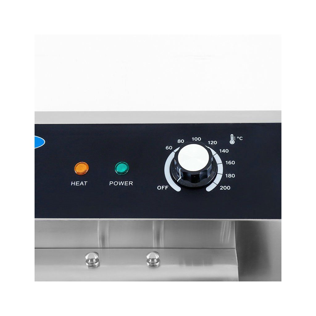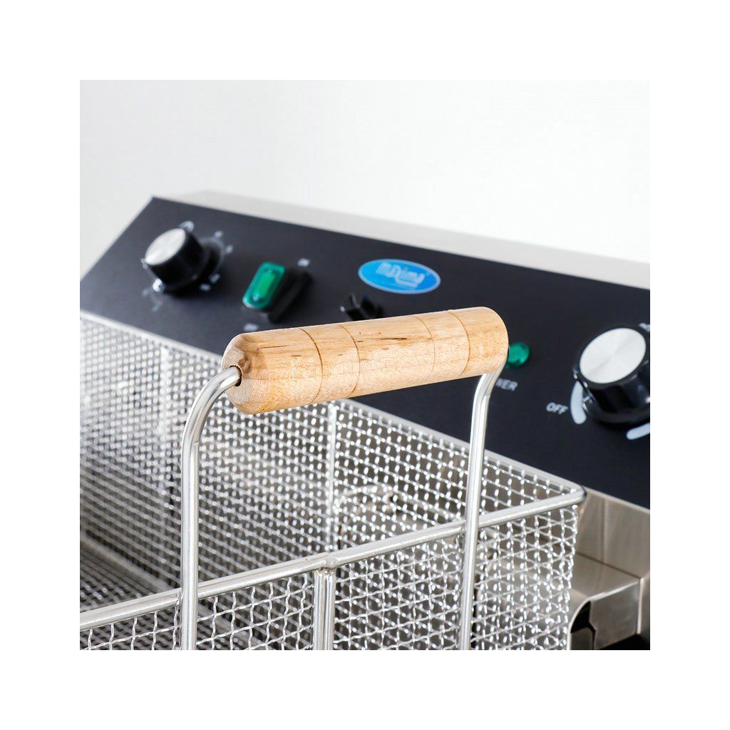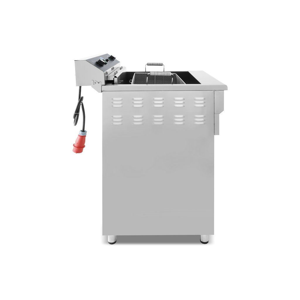 Fritéza pracuje na trojfázový prúd (400 V) a je vybavená ochranou proti preťaženiu. Vďaka obsiahnutej chladiacej zóne v spodnej časti fritézy môžete fritovací olej používať opakovane, bez toho, aby sa zmenila chuť vyprážaných potravín. Ohrievacie teleso je umiestnené niekoľko centimetrov nad dnom zásobníka, a pretože sa olej pod ohrievacím telesom toľko nezahrieva, omrvinky sa menej rýchlo pripaľujú. Olej tak zostáva dlhšie čistý a nemusíte ho tak často meniť. Fritéza je tiež vybavená termostatom, ktorý umožňuje nastaviť teplotu v rozmedzí 50 až 200 °C. Vďaka praktickému časovaču môžete vyprážať všetky pochutiny v ideálny čas, bez toho, aby ste sa museli obávať, že sa niečo spáli. Fritéza má navyše odnímateľné veko, ktoré zabraňuje rozstreku oleja. Rukoväte sú žiaruvzdorné a na bočnú stranu môžete pripevniť dodávanú poličku, ktorá zachytí všetky zvyšky po vyprážaní.