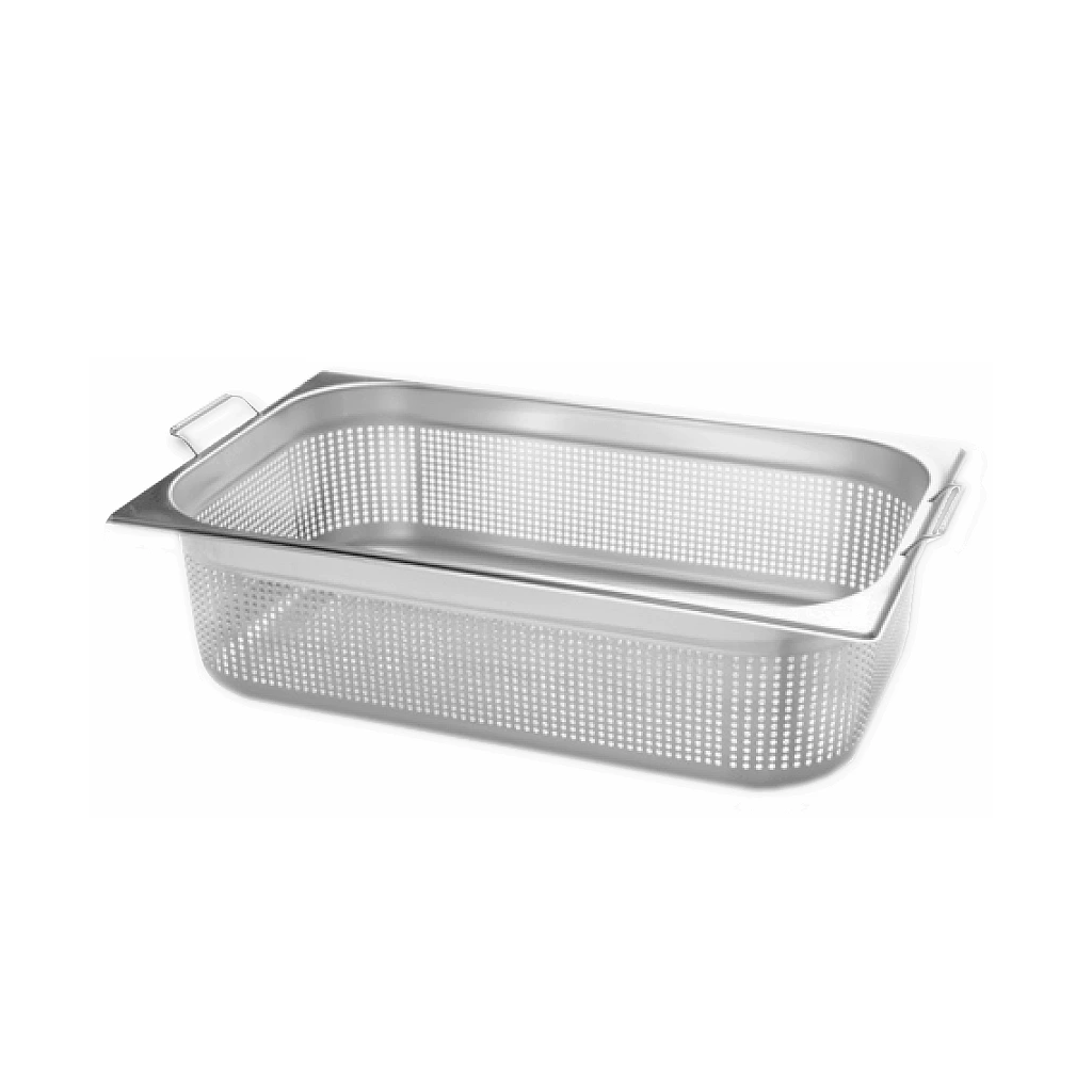 Dierovaná gastronádoba z radu Profi sa vďaka svojmu všestrannému využitiu a vysokej kvalite rýchlo stane nepostrádateľným pomocníkom v každej profesionálnej kuchyni. Môžete v nej variť, smažiť, ohrievať aj vydávať pokrmy. Dá sa tiež použiť na naparovanie zeleniny alebo na prípravu jedla v konvektomate až do teploty 300 °C. Po stranách nájdete úchyty, ktoré vám uľahčia manipuláciu. Nádoba sa vyrába z nehrdzavejúcej ocele 18/10 (18 % niklu, 10 % chrómu), ktorá garantuje jej vysokú odolnosť, dlhú životnosť a dovoľuje ju umyť v umývačke riadu.Gastronádoba Profi dierovaná s úchytmi GN 1/1 150 mm