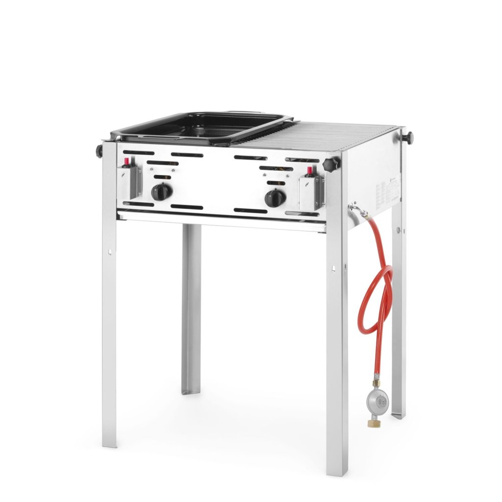 Rám vyrobený z nehrdzavejúcej ocele. Dvojitý povrch: polovičná mriežka z nehrdzavejúcej ocele, polovičný smaltovaný plech na pečenie mäsa. Rozmery plechu na pečenie mäsa: 603x360x(H)60 mm. Rozmery varnej plochy grilovacieho plechu: 290 x 480 mm. Piezoelektrický zapaľovač. Vhodné na použitie s propánom a butánom. Súčasťou dodávky je plynová hadica a regulátor tlaku.Buďte prvý, kto napíše príspevok k tejto položke.