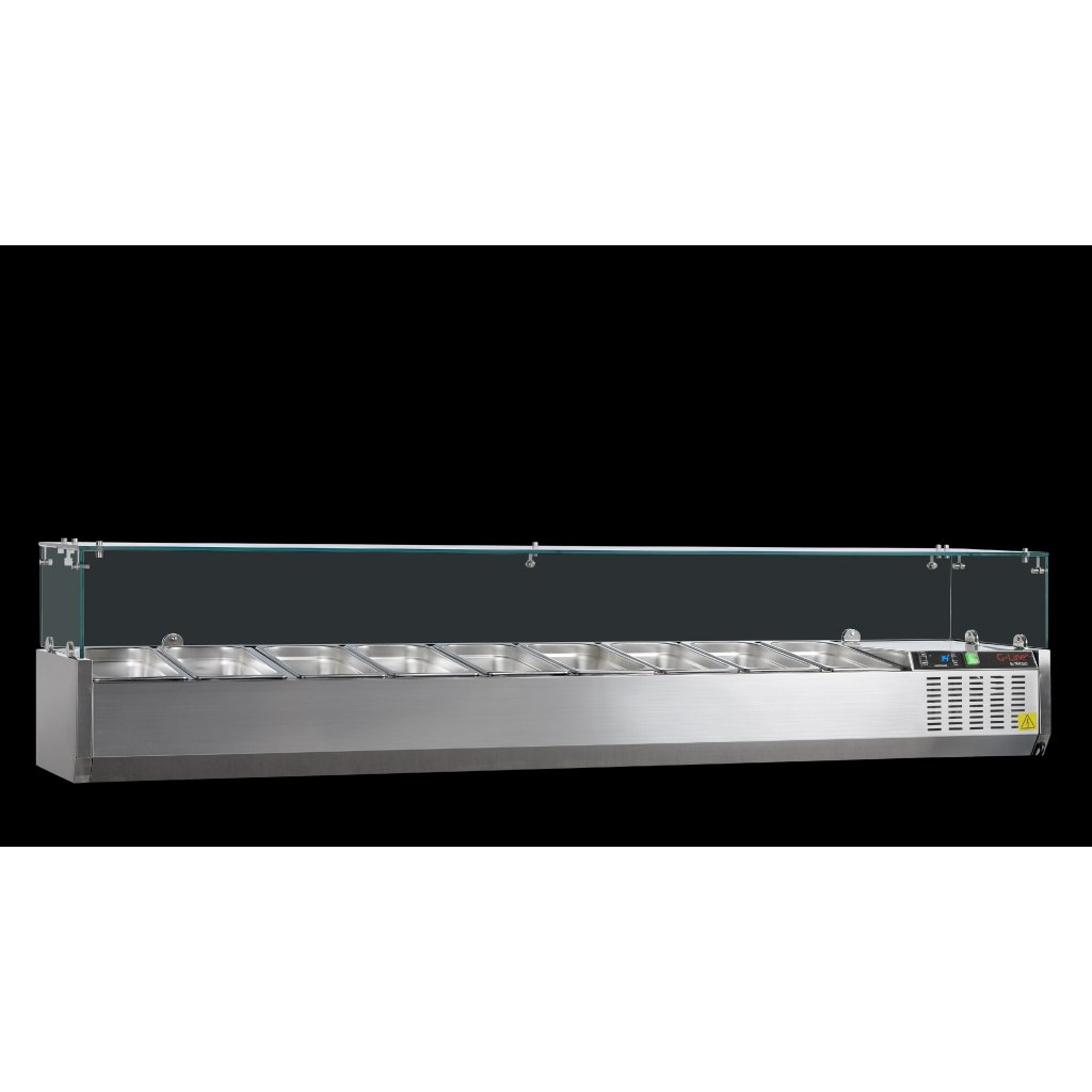 Stolná chladiaca nadstavba GN1/4 Chladiaca nadstavba na gastronádoby GN 1/4 vhodná pre pizzerie, rýchle občerstvenia či menšie prevádzky. Gastronádoby nie sú súčasťou. GVC33-120: 5 x GN 1/4 GVC33-150: 7 x GN 1/4 GVC33-180: 9 x GN 1/4 GVC33-200: 10 x GN 1/4Dodatočné parametre