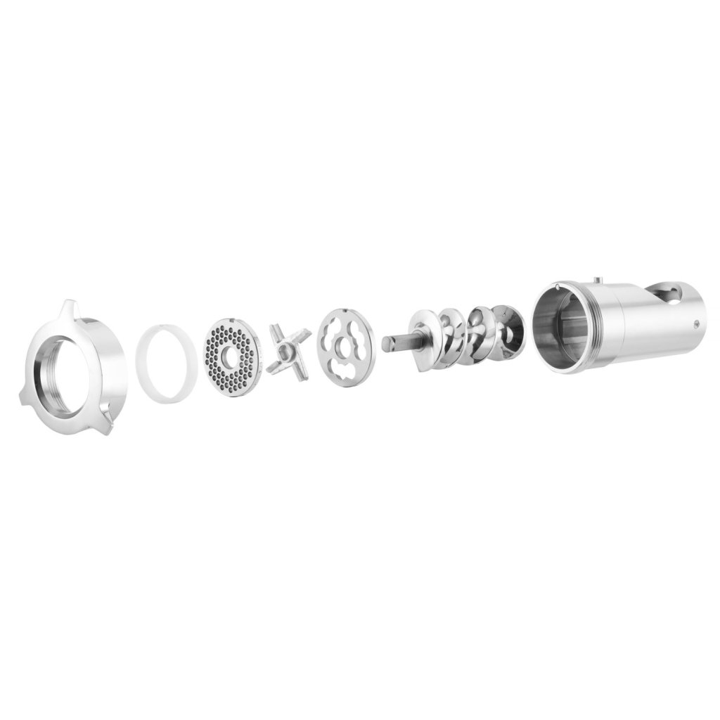 Spoľahlivá konštrukcia z nehrdzavejúcej ocele Vymeniteľné súčiastky: hrdlo skrutka sitko predmletia (model Unger) nôž s krájacími hranami na jednej strane (model Enterprise) alebo na oboch stranách (model Unger) sitko (otvory ø6 mm) plastový prítlačný krúžok prítlačná matica Pohon PS-22 a prídavné sitko na zakúpenie samostatneBuďte prvý, kto napíše príspevok k tejto položke.
