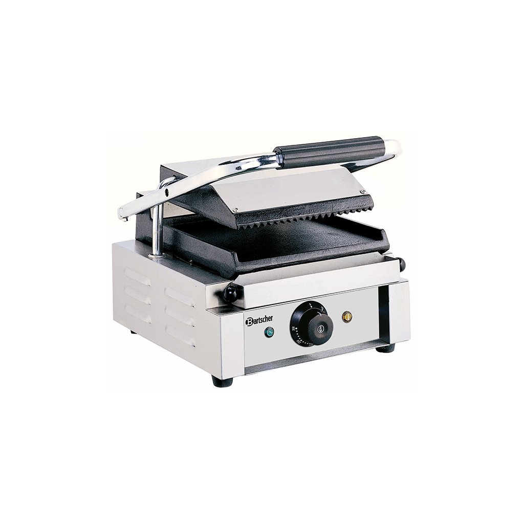 Kontaktný gril: - horná grilovacia doska vrúbkovaná, spodná hladká, - horná grilovacia doska: š 214 x h 214 mm, - spodná grilovacia doska: š 220 x h 235 mm, - príkon: 1,8 kW / 230 V 50 Hz, - rozmery: Š 290 x D 370 x V 200 mm, - hmotnosť: 14 kg.Kontaktné grily Bartscher sú: - odolné spotrebiče z chrómniklovej ocele, - liatinové grilovacie dosky pre optimálny prenos tepla, - termostat nastaviteľný od 50 °C do 300 °C, - kontrolka predohrevu, - Kontrolka zapnutia/vypnutia, - zberná nádoba na tuk, - čistiaca kefka je súčasťou dodávky.Dodatočné parametre
