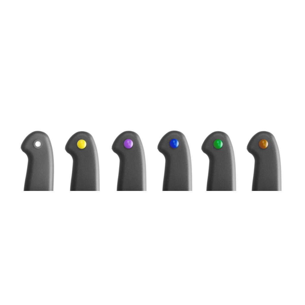 Čepeľ z nehrdzavejúcej ocele, polypropylénová rukoväť. Súprava obsahuje ľahko pripevniteľné farebné cvočky umožňujúce označenie radielka v súlade s princípmi HACCAP.Buďte prvý, kto napíše príspevok k tejto položke.