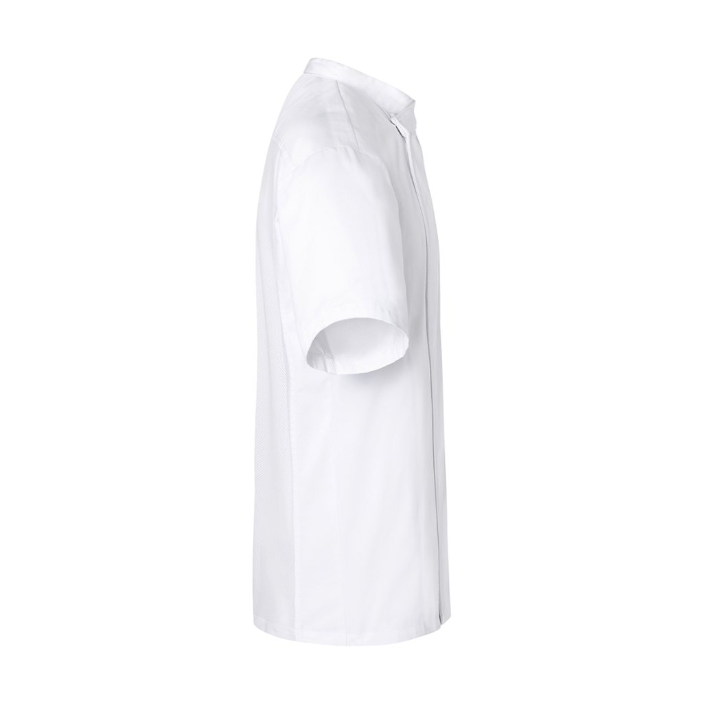 | predná časť: keprová väzba, 65 % polyester / 35 % bavlna, 215 g/m² | zadná časť: úplet, 100 % polyester, priedušný, regulujúci vlhkosť | zadná časť: úplet, 100 % polyester, priedušný, regulujúci vlhkosť | moderná kuchárska košeľa s krátkymi rukávmi pre príjemný komfort pri nosení | jednoduché obliekanie cez hlavu | zadná vložka z úpletu (sieťovina) zaisťuje pohodlie a príjemný pocit | skrytá gombíková léga so stláčacími gombíkmi | rozopnutím patentných gombíkov sa zväčší obvod košele a uľahčí sa obliekanie | na ľavej strane hrudníka vrecko s lemovaním (2 x 11,5 cm) | ľavý rukáv s vreckom s lemovaním (1,5 x 6 cm) | zodpovedajúci výrobok: Dlhé sako s dlhými rukávmi - BJM 4 (číslo výrobku výrobcu)Dodatočné parametre
