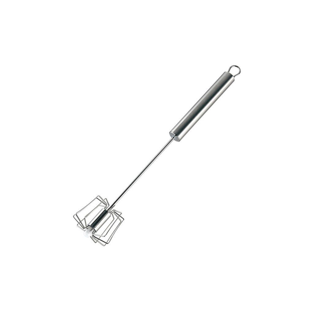 Táto otočná metlička je ideálna na jednoduché a rýchle miešanie potravín. Stačí ju ľahko zatlačiť a automaticky sa otočí. Nevyhnutný pomocník v každej kuchyni, pretože mieša, šľahá a emulguje omáčky, krémy, cestá a predovšetkým bielky na sneh. Má nerezovú rukoväť aj drôty a závesné oko pre pohodlné skladovanie. Možno ju umývať v umývačke riadu.Mechanický šľahač 25 cm