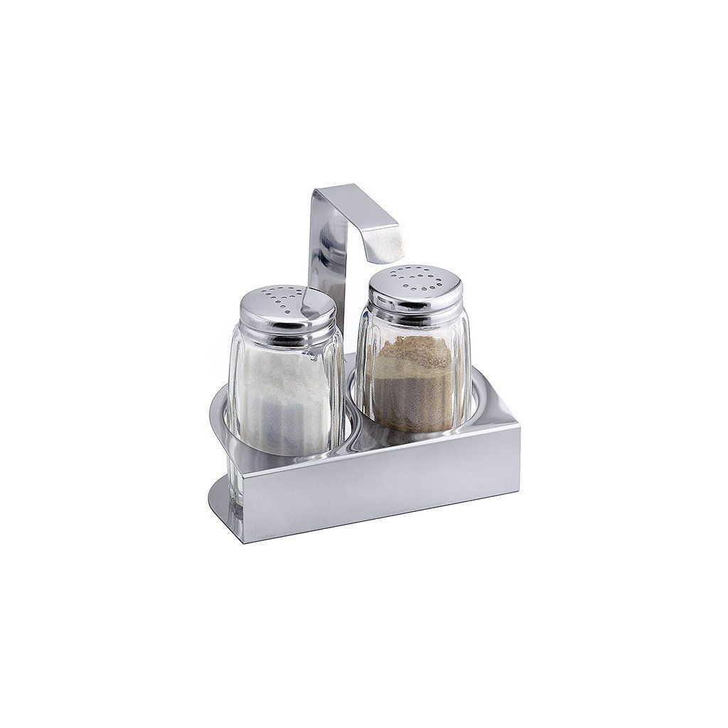 Menážka pozostávajúca z podstavca vyrobeného z leštenej nehrdzavejúcej ocele, soľničky a koreničky vyrobených z hrubého skla.Dodatočné parametre