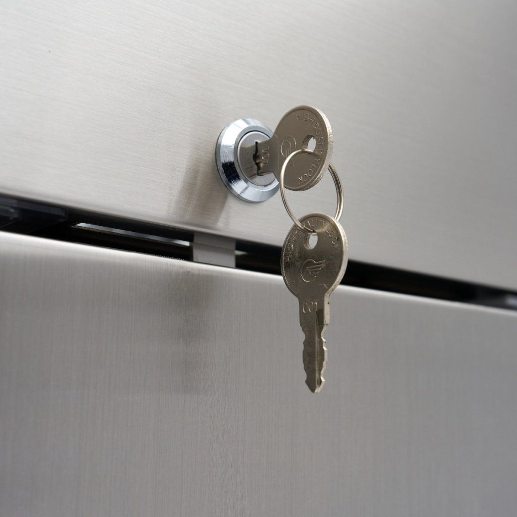 Mraznička je vybavena čtyřmi robustními kolečky (dvě s brzdami), díky nimž ji lze snadno přemístit při úklidu nebo reorganizaci v kuchyni. Bezpečný zámek dveří a silná izolace podporují bezpečnost výrobků i energetickou účinnost, takže tato mraznička je spolehlivým dlouhodobým řešením.