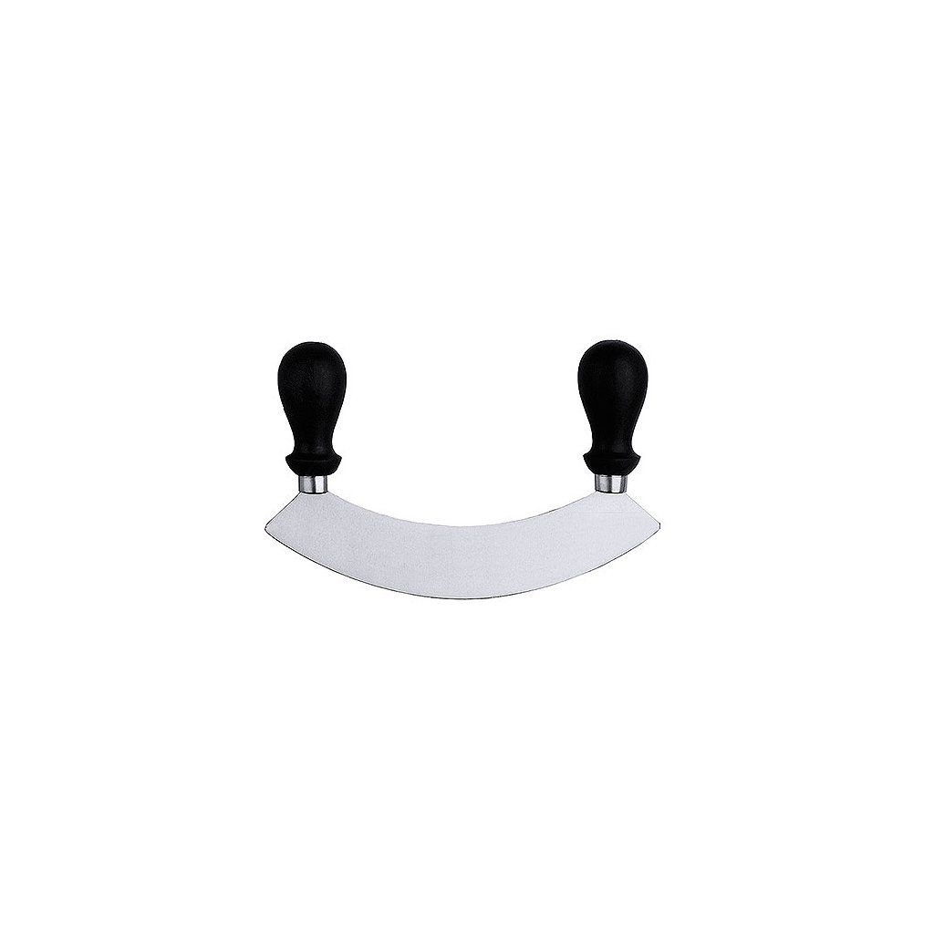 Kolískový nôž s jednou čepeľou vyrobený zo saténovej chróm-molybdénovej ocele s čiernymi úchytmi z polyetylénu.Dodatočné parametre
