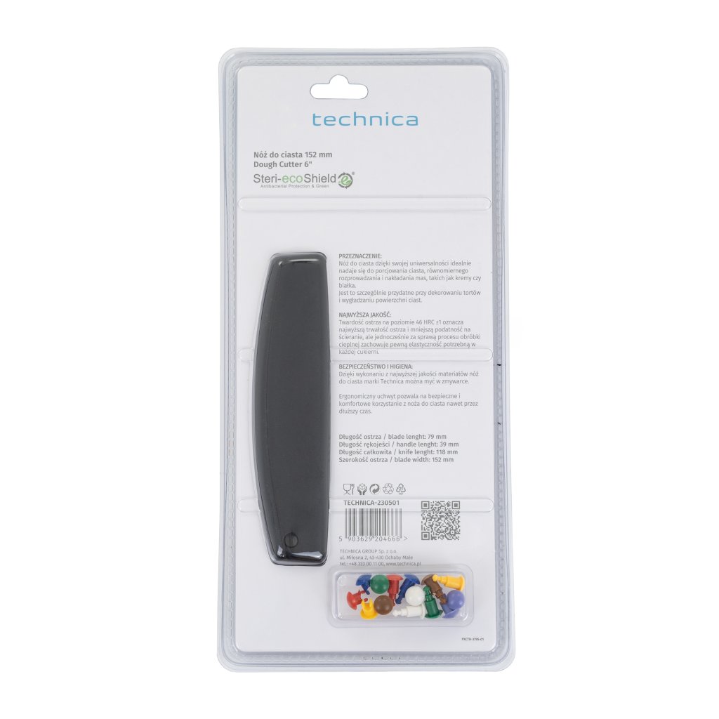 Nôž na cesto Technica so šírkou čepele 152 mm je nepostrádateľný doplnok v každej kuchyni aj cukrárni. Navrhnutý pre intenzívne používanie, má hladkú čepeľ vyrobenú z nemeckej legovanej ocele, ktorá zaručuje výnimočnú ostrosť a odolnosť. Čierna rukoväť z polypropylénu s ochrannou vrstvou Steri-Eco Shield zaisťuje pohodlie pri používaní a chráni pred rozvojom baktérií, čo robí tento nôž ideálnou voľbou pre profesionálne použitie.