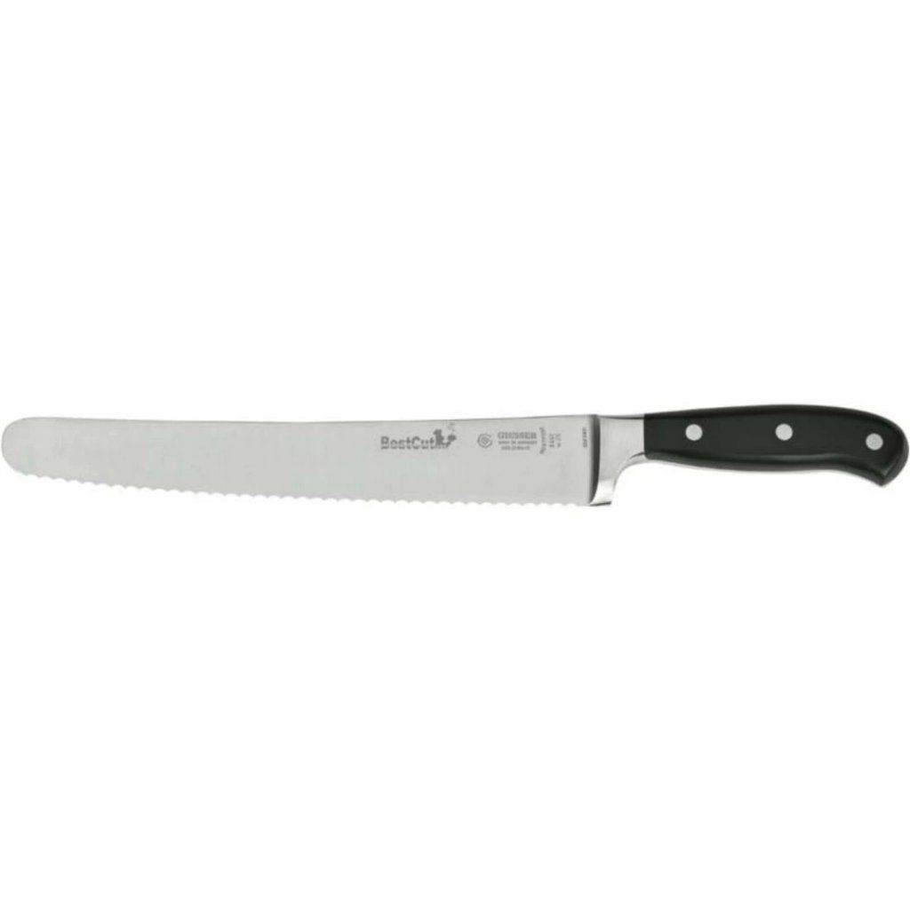 Nôž od nemeckého výrobcu Giesser nesmie chýbať v žiadnej kuchyni. Jeho čepeľ sa vyrába z kvalitnej nehrdzavejúcej ocele a plastová rukoväť umožňuje jednoduché uchopenie.Nôž na pečivo 25 cm
