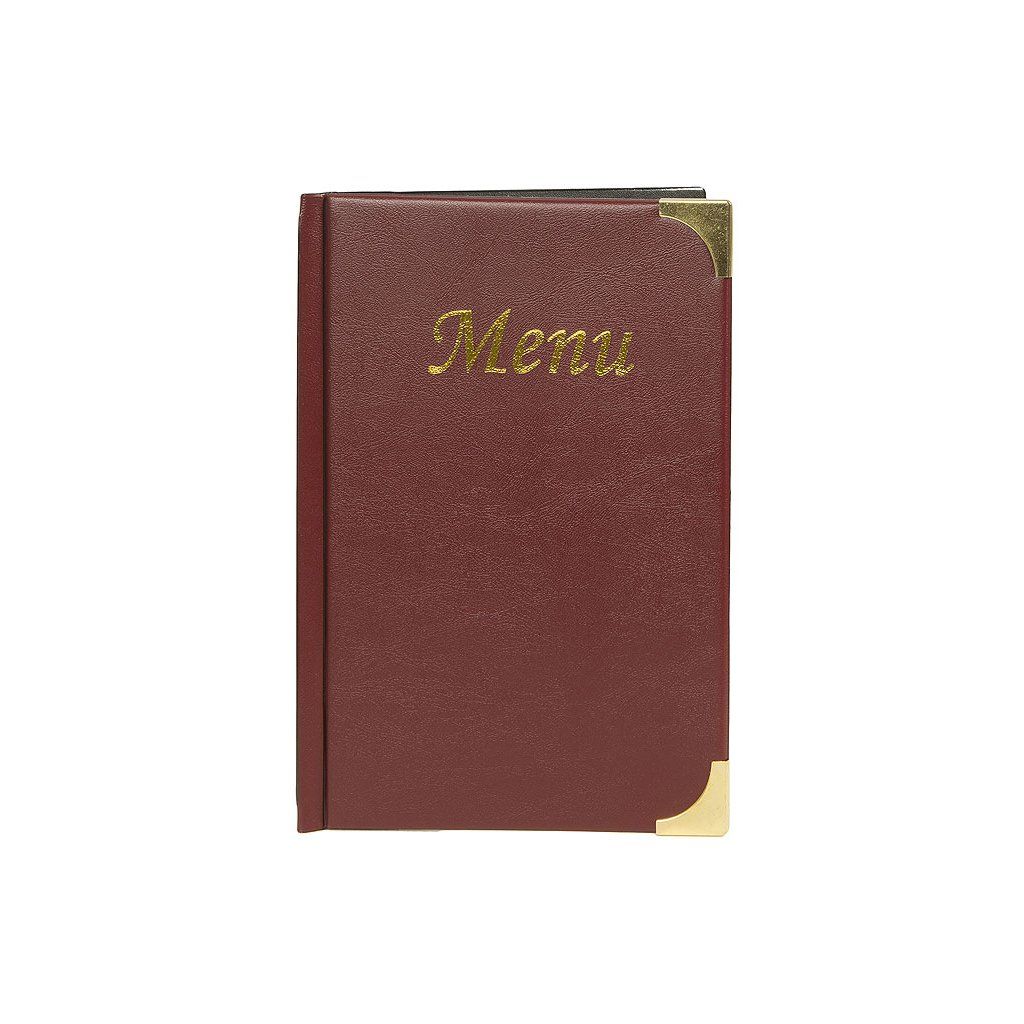 Obal na jedálny lístok so zlatým nápisom "Menu" vo formáte A5. Ľahko sa čistí. Vyrobené z odolného materiálu podobného koži. Maximálne na 10 papierov A5 (2 miesta na obale a 4 obojstranné vložky).Dodatočné parametre