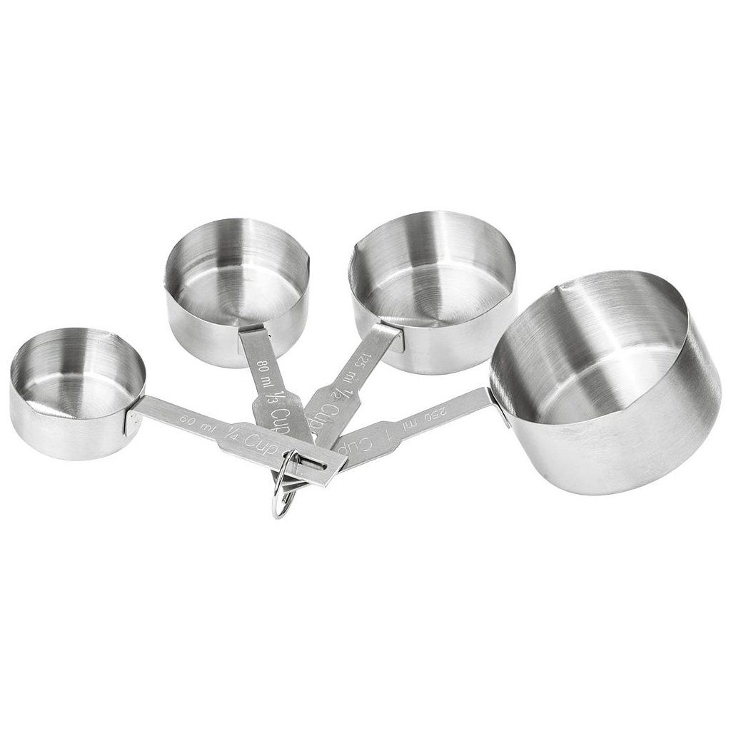 Odmerka z nehrdzavejúcej ocele. V súprave 4 veľkosti: 1/4 hrnčeka (60 ml) 1/3 hrnčeka (80 ml) 1/2 hrnčeka (125 ml) 1 hrnček (250 ml) Obsah viditeľný na úchytkách.Dodatočné parametre