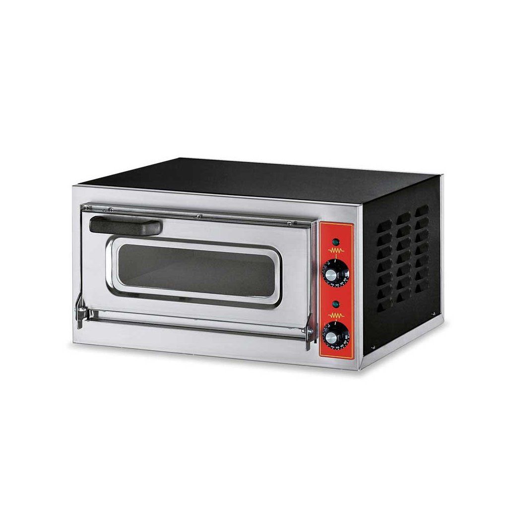 Pizza pec - určený na pizzu s priemerom 40 cm - teplota do 500° Celzia - šamotová doska na spodu komory - osvetlenie komory - neutrálne vykurovacie telesá - opláštenie z ocele lakovanej na čiernoDodatočné parametre