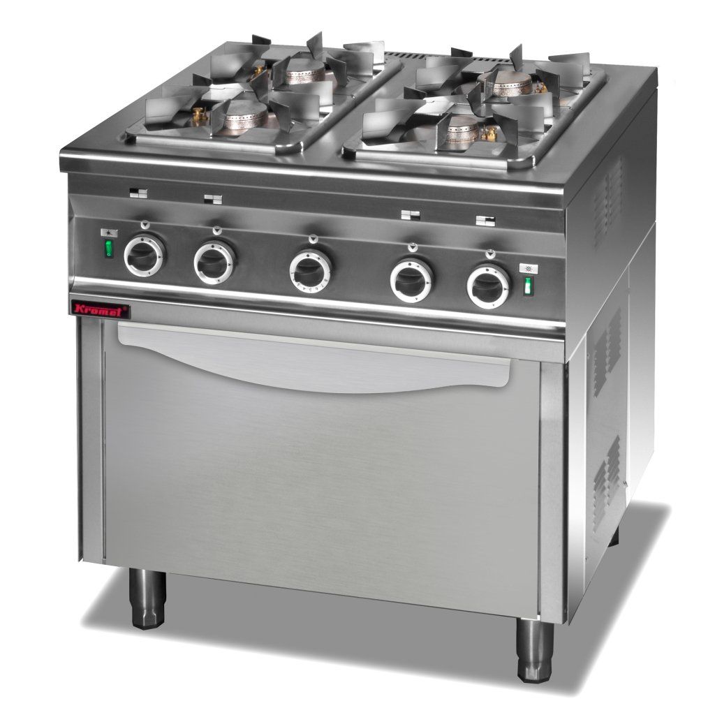 Plynový sporák Kromet s plynovou rúrou, spoľahlivý a ľahko použiteľný- Horáky: 1x 2,5 kW, 3x 3,5 kW- Energeticky úsporné horáky (plameň šetrí 25 % maximálnej spotreby plynu) s ochranou proti spätnému toku.- Konštrukcia zabraňujúca odkvapkávaniu do vnútorného priestoru- Dbajte na hygienu - vyberateľné panvice, horáky a rošty- Ergonomické gombíky pre ľahké nastavenie veľkosti plameňa- Horáky od talianskej spoločnosti ARC- Ochrana proti spätnému toku- Plynová rúra s výkonom 5,5 kW- Kapacita rúry: GN 2/1 530x650 mm- Ergonomická rukoväť rúry- Piezoelektrické zapaľovanie horáka rúry- Nastaviteľné nohy- Plynová prípojka: R 1/2"- Pred objednaním uveďte typ plynu (sieť, fľaša).- Štandardná výbava (zahŕňa): rošt rúry- Voliteľné vybavenie (za príplatok): presklené dvereDodatočné parametre
