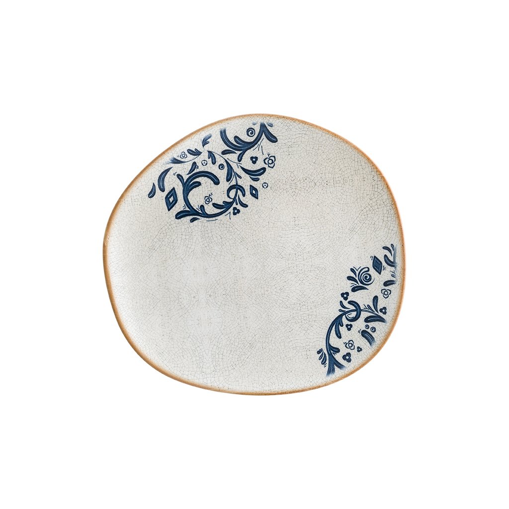 - Farba a vzor: Séria Viento Vago v jemných farbáchkrémovo biela s jemnou, ľahko odretou povrchovou úpravou, ktorá jej dodáva rustikálny, ručne vyrábaný dojem. Povrch taniera zdobia dekoratívne, asymetrické vzory v hlbokej farbetmavo modrá farby, ktoré zobrazujú kvetinové motívy - listy a kvety.