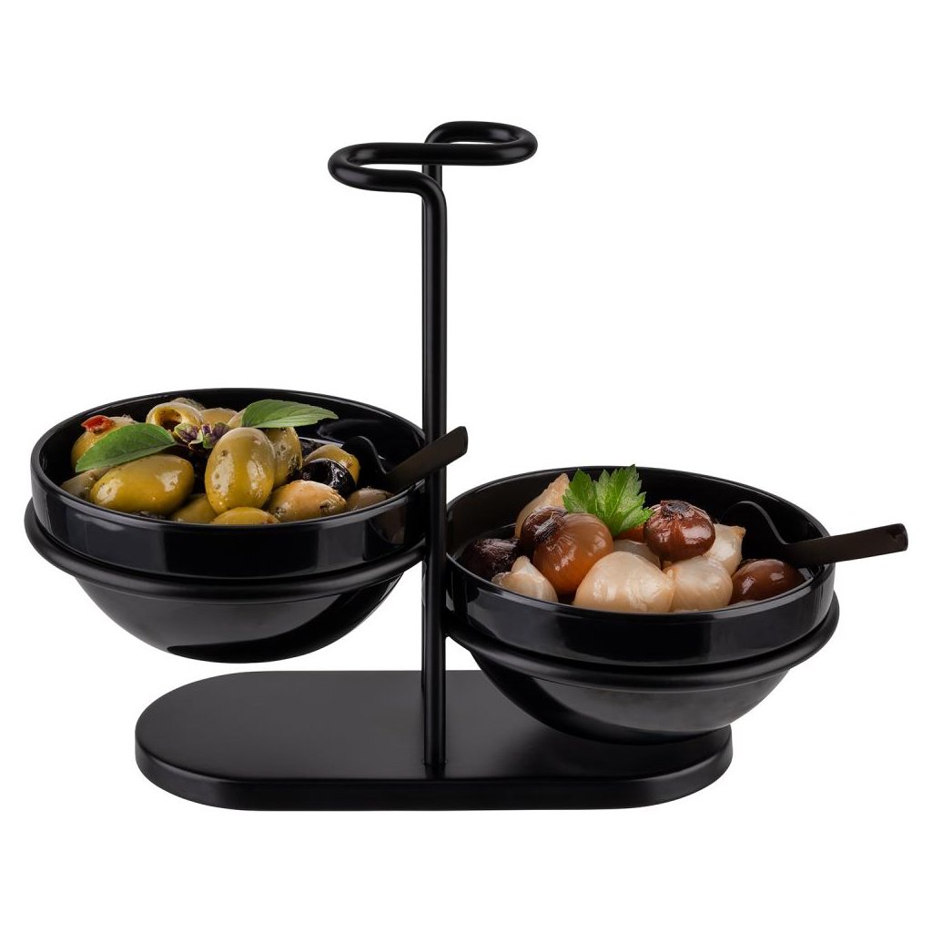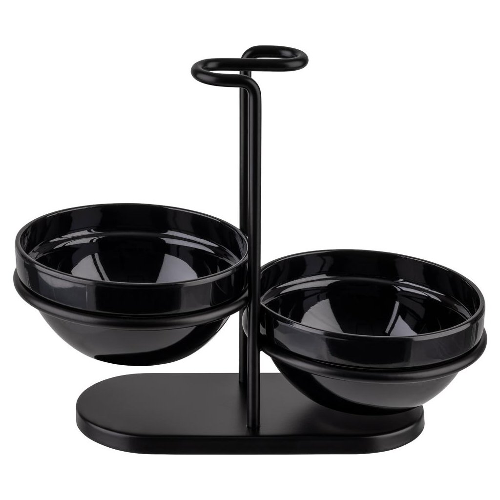 Stojan na lyžice s dvoma miskami je praktickýbufetový stojan, ktorá sa bude hodiť do každej kuchyne. Je vyrobený z vysoko kvalitnej nehrdzavejúcej ocele a melamínu a vyznačuje sa elegantnou čiernou farbou, ktorá dodá štýl každému stolu.