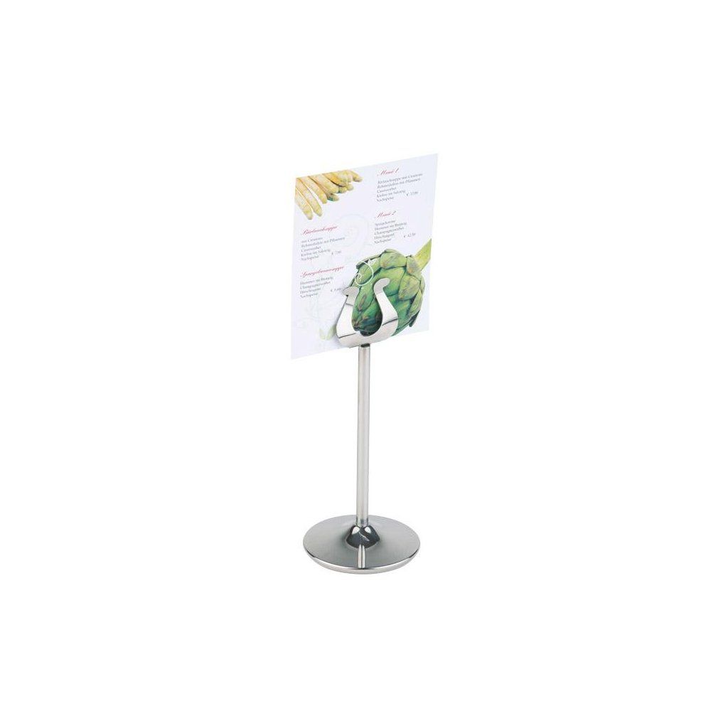 Stojan na menu vyrobený z leštenej, nerezovej ocele. Môže slúžiť ako stojan na menu alebo na číslovanie stola. Vysoká kvalita. Vhodné do umývačky riadu.Dodatočné parametre