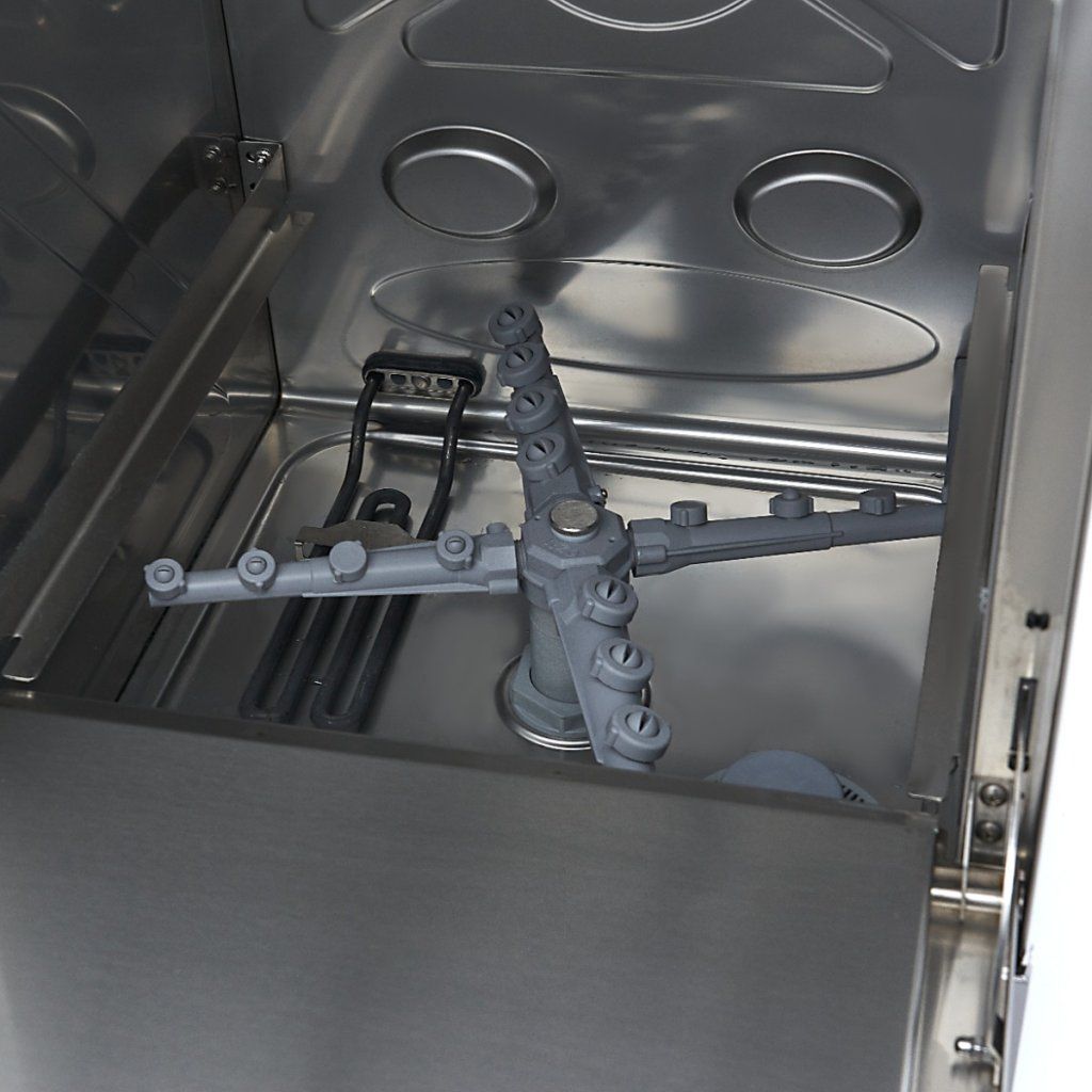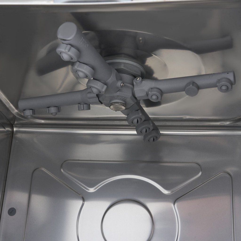 Táto umývačka riadu je veľmi úsporná, pretože na jeden umývací cyklus spotrebuje iba 2,5 l vody. Ponúka bezpečnostné funkcie, ako je tepelná ochrana a ochrana IPX5 ovládacieho panela. Umývačka sa tiež ľahko ovláda pomocou jediného tlačidla na naplnenie a ohrev vody v nádrži bojlera. Digitálny tlakový spínač pracovnej nádrže umožňuje jednoduché nastavenie hladiny vody, zatiaľ čo termostat ovláda NTC čidlo. Riad sa umýva pri 55-60 °C a oplachuje pri 80-85 °C, čo vedie k rýchlejšiemu sušeniu. Môžete si zvoliť predhriatie vody alebo začať so studeným umývaním. Štyri kontrolky ukazujú stav naplnenia, ohrevu, umývania a dĺžku programu. Po dokončení cyklu umývačka vydá zvukový signál. Dodáva sa s košom na sklo s rozmermi 40 x 40 cm, košom na taniere s rozmermi 40 x 40 cm, košom na príbory a prívodnou a vypúšťacou hadicou na pripojenie k prívodu vody. Súčasťou umývačky je oplachovacie čerpadlo, nie však mydlové a vypúšťacie čerpadlo. Štyri nastaviteľné nožičky umožňujú jednoduché prispôsobenie výšky.