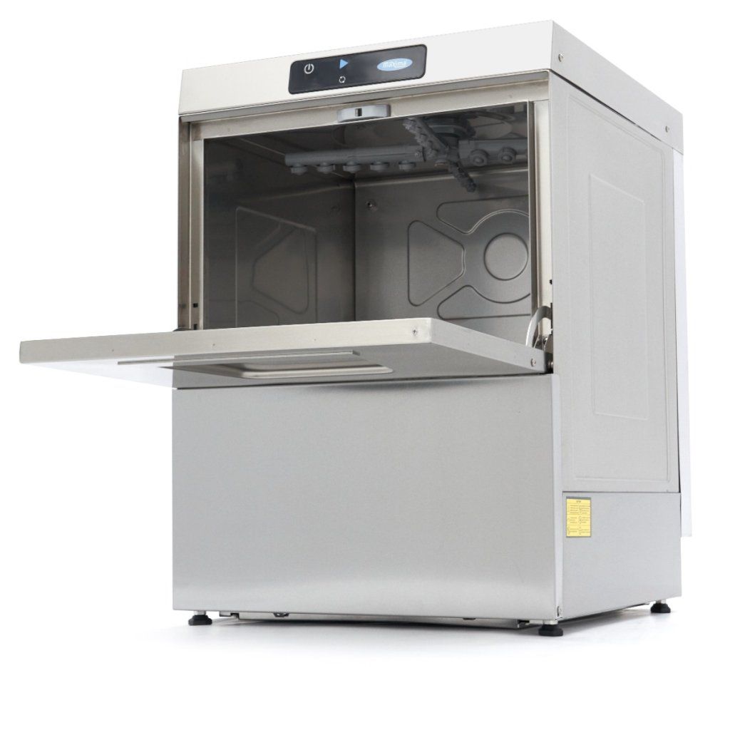 Táto umývačka riadu je veľmi úsporná, pretože na jeden umývací cyklus spotrebuje iba 2,8 l vody. Ponúka bezpečnostné funkcie, ako je tepelná ochrana a ochrana IPX5 ovládacieho panela. Umývačka sa tiež ľahko ovláda pomocou jediného tlačidla na naplnenie a ohrev vody v nádrži bojlera. Digitálny tlakový spínač pracovnej nádrže umožňuje jednoduché nastavenie hladiny vody, zatiaľ čo termostat ovláda NTC čidlo. Riad sa umýva pri 55-60 °C a oplachuje pri 80-85 °C, čo vedie k rýchlejšiemu sušeniu. Môžete si zvoliť predhriatie vody alebo začať so studeným umývaním. Štyri kontrolky ukazujú stav naplnenia, ohrevu, umývania a dĺžku programu. Po dokončení cyklu umývačka vydá zvukový signál. Dodáva sa s košom na sklo s rozmermi 50 x 50 cm, košom na taniere s rozmermi 50 x 50 cm, košom na príbory a prívodnou a vypúšťacou hadicou na pripojenie k prívodu vody. Súčasťou umývačky sú oplachovacie, mydlové a vypúšťacie čerpadlá. Štyri nastaviteľné nožičky umožňujú jednoduché prispôsobenie výšky.