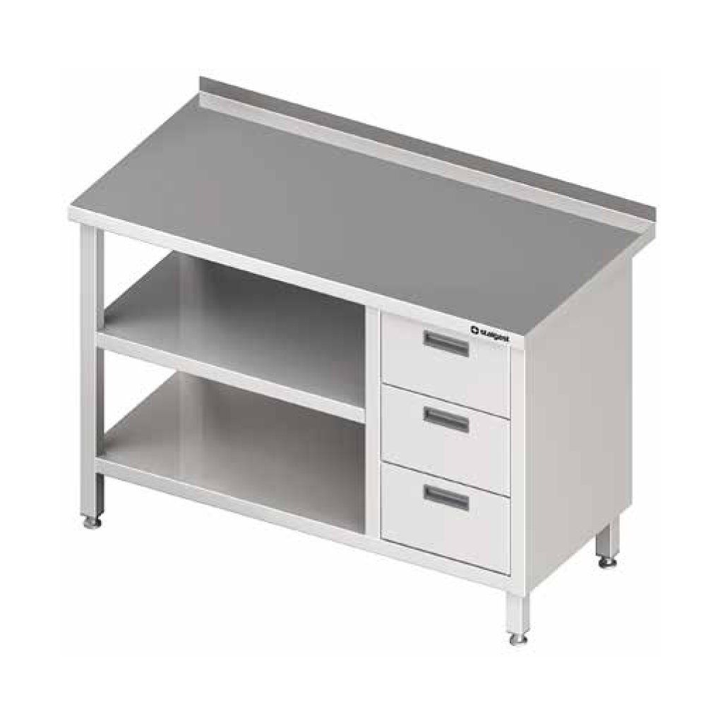 Prístenný stôl s blokom troch zásuviek a dvomi policami 1400x600x850 mm vyrobený z kvalitnej nehrdzavejúcej ocele. Hĺbka zásuviek 150 mm. Blok zásuviek na ľavej strane. Možnosť montáže zámku za poplatokDodatočné parametre