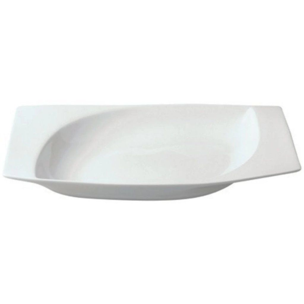 Hlboký tanier z porcelánu v bielom prevedení bez dekoru v úzkom prevedení. Krivky kolekcie Mazza pôsobia moderným šarmom, ktorý dovoľuje popustiť uzdu fantázii a zaujme vašich hostí na prvý pohľad. Na bielej farbe parádne vyniknú rôzne druhy pokrmov. Tanier má širší okraj, ktorý môžete ozdobiť pomocou glazúry napr. vašim logom.Tanier hlboký 20 ×13 cm