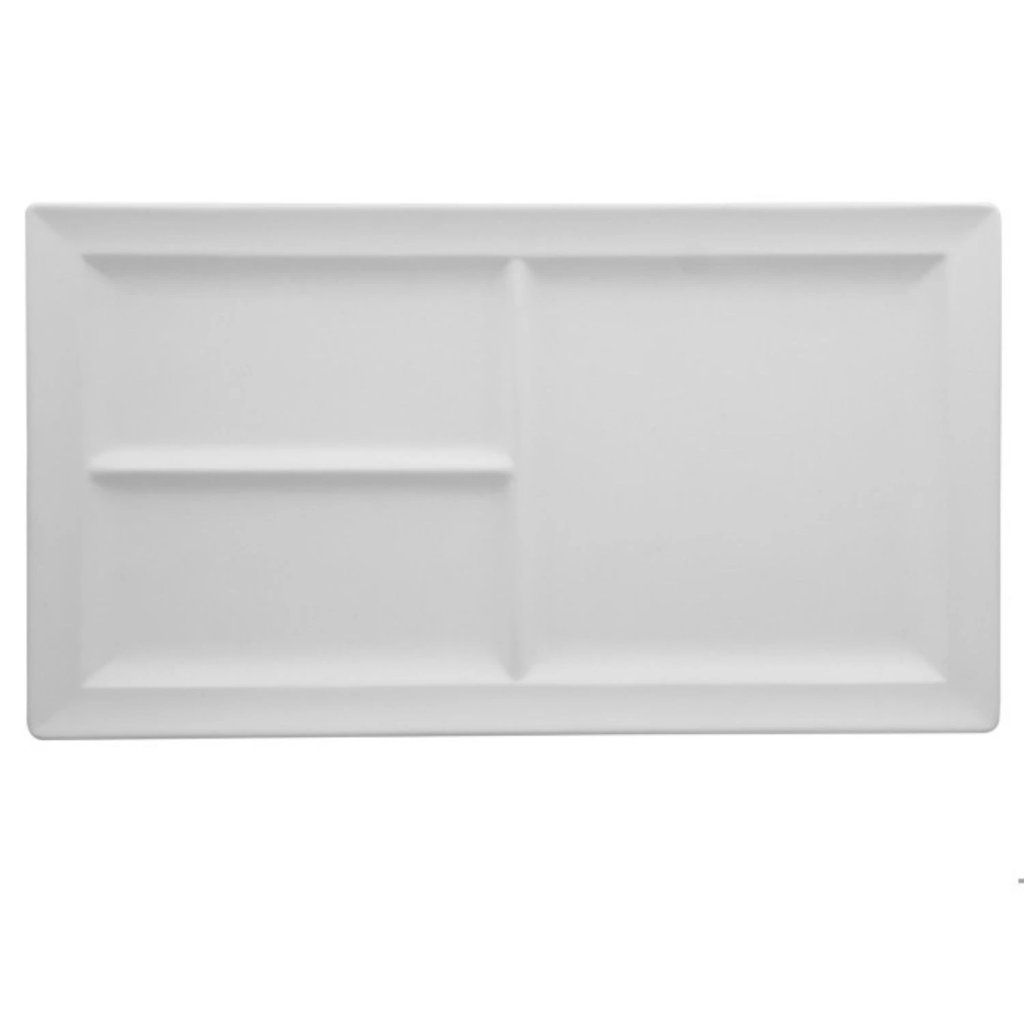 Trojdielny tanier z kolekcie Classic Gourmet spoznáte podľa minimalistického dizajnu, ktorý sa stane elegantným doplnkom každého jedálenského stola. Praktické rozdelenie na tri časti vám dovolí oddeliť jedlo podľa vašej potreby (napríklad príloha, mäso a dip).Tanier plytký 39 × 21 cm – trojdielny