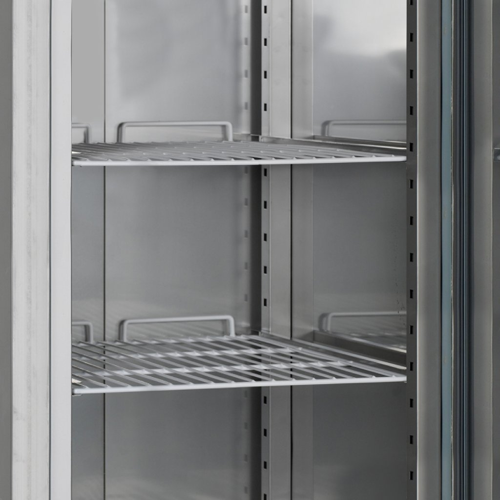 Dvojdverová nerezová mraziaca skriňa pre profesionálne kuchyne Rad RF-X mraziacich skríň s 1 alebo 2 plnými dverami je určená pre profesionálne kuchyne a disponuje nastaviteľnými policami. Chladiaca skriňa je vyrobená z vysoko kvalitnej nerezovej ocele SS304 vhodnej pre gastronómiu a má odolné kolieska pre ľahké premiestňovanie. Chladenie s ventiláciou zaisťuje optimálnu teplotu, ktorú je možné nastaviť na digitálnom termostate. Funkcia Bluetooth umožňuje jednoduché monitorovanie prostredníctvom aplikácie.Dodatočné parametre