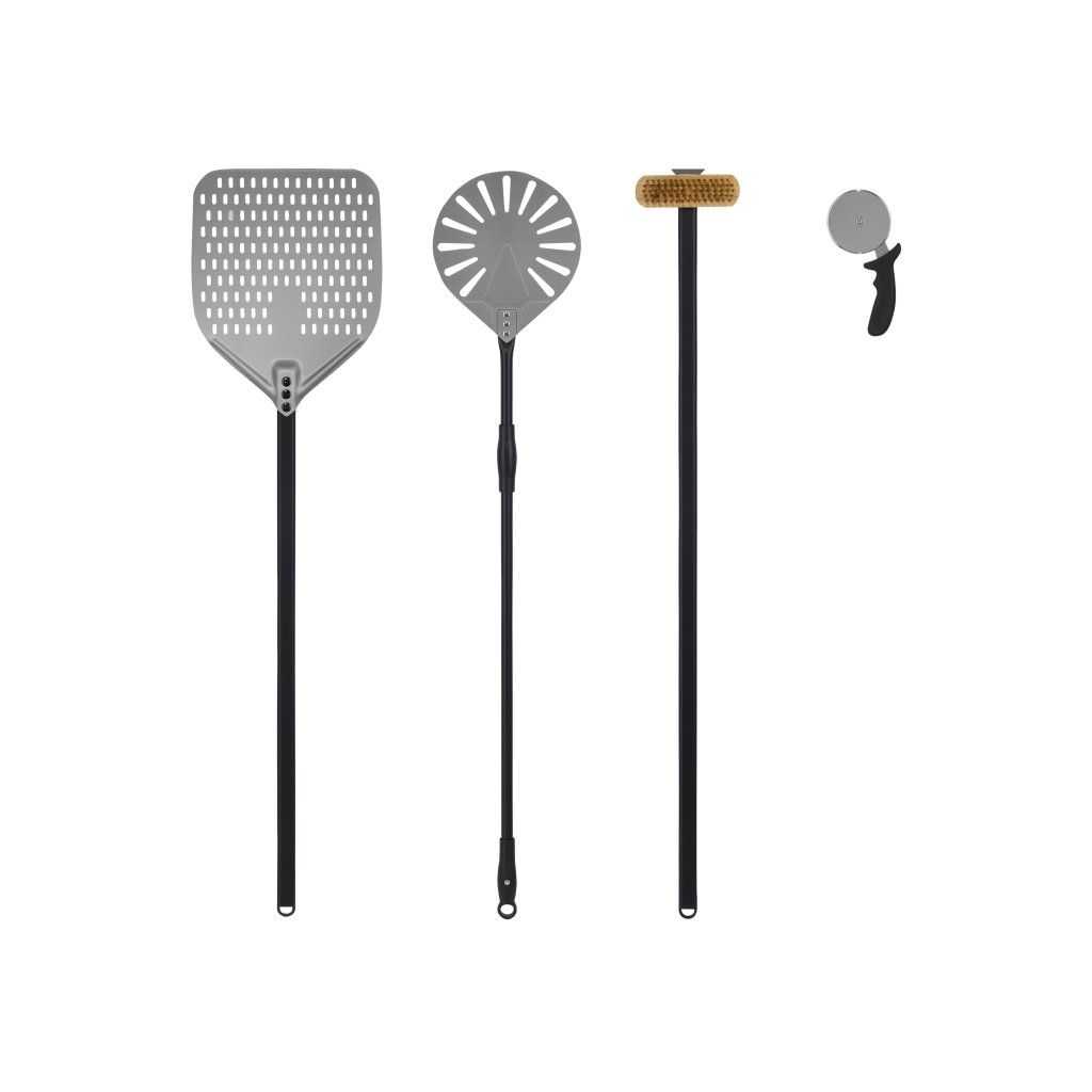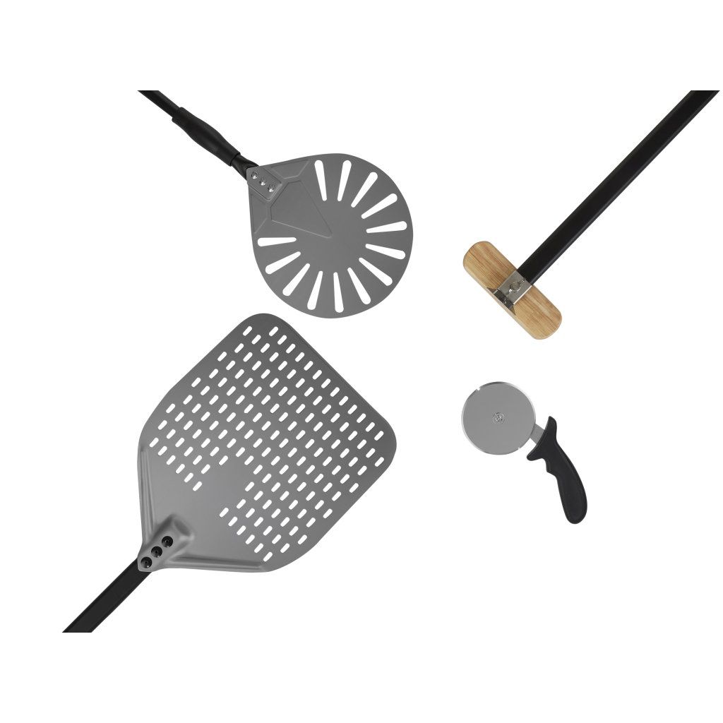 Súčasťou sú: čierna, perforovaná lopata na pizzu z anódového hliníka s hliníkovým úchytom, štvorcová s rozmermi 300x355 mm a dĺžkou 1200 mm. Čierna perforovaná lopatka na pizzu z anódového hliníka s hliníkovým úchytom, okrúhla, priemer 228 mm a dĺžka 1200 mm. kefa na čistenie pece s úchytom z hliníka s dĺžkou 1200 mm. Krájadlo na pizzu s priemerom 100 mm. Čepeľ vyrobená z nehrdzavejúcej ocele.