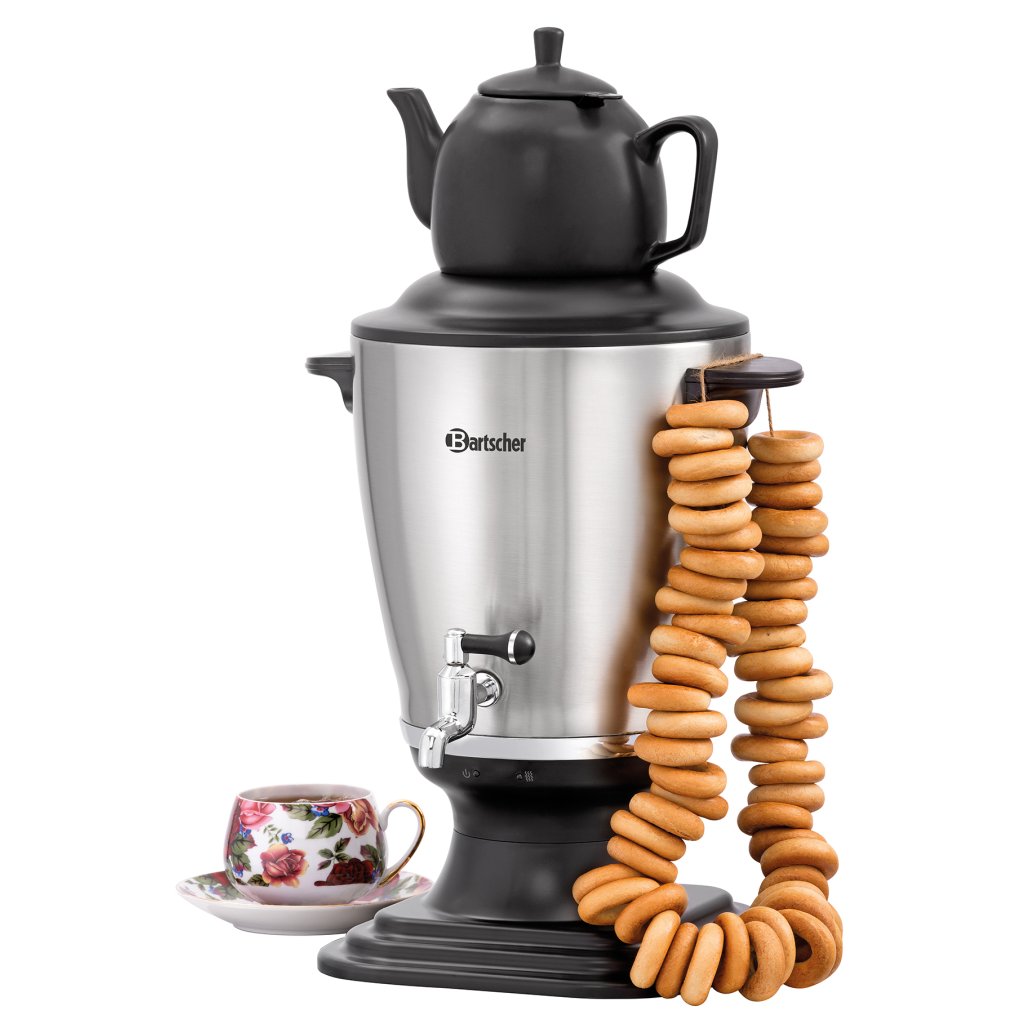 Samovar 3.2L - nehrdzavejúca oceľ, plast - objem: 3,2 litra, 200 mm - nevyhrievané rukoväte - Ochrana proti prehriatiu - Funkcia automatického vypnutia - funkcia konštantného tepla - príkon: 2 kW \/ 220-240 V 50-60 Hz - Rozmery: Š 270 x H 275 x V 495 mm (s kanvicou na kávu) - hlinená kanvica na kávu, objem: 0,8 l, sieťový filter na čaj je súčasťou balenia - hmotnosť: 2,15 kgDodatočné parametre
