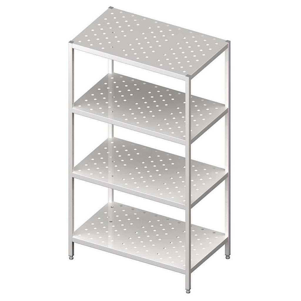 Skladový regál 1300x700x1800 mm vyrobený z nehrdzavejúcej ocele. Rozložený – na samostatnú montáž, na želanie zákazníka je možné vyrobiť zváraný /zložený / za poplatok. Police perforované. Nohy vyrobené z L profilu, spojené s policami pomocou skrutiek. Možná regulácia postavenia políc. Maximálne zaťaženie police 70 kg / na meter štvorcový.Dodatočné parametre