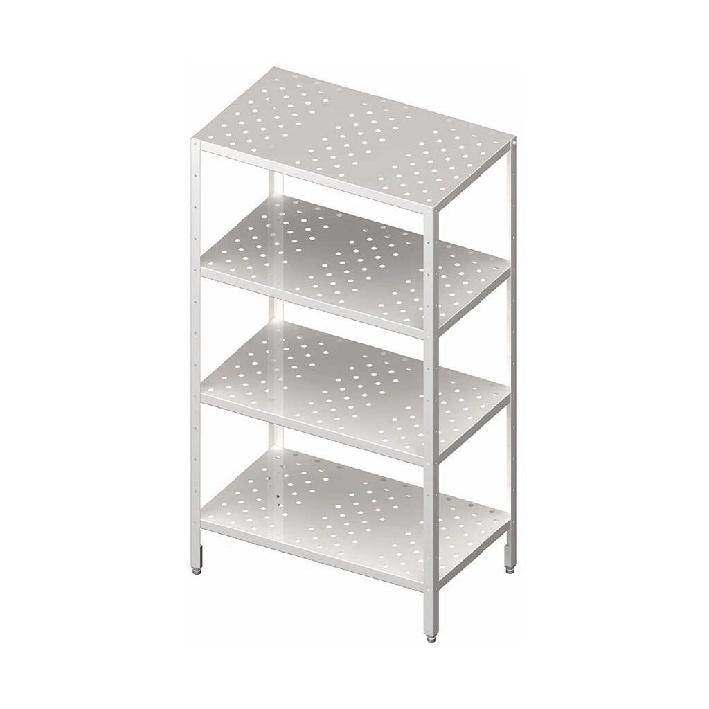 Skladový regál 600x500x1800 mm vyrobený z kvalitnej nehrdzavejúcej ocele. Dodávané v rozobratom stave – na samostatnú montáž. Na želanie zákazníka je možné dodať vo zváranom stave /zložené / za príplatok. Perforované police. Nohy vyrobené z L profilu, spojené s policami pomocou skrutiek. Možnosť regulácie polohy políc. Maximálne zaťaženie na policu 70 kg/ na meter štvorcovýDodatočné parametre