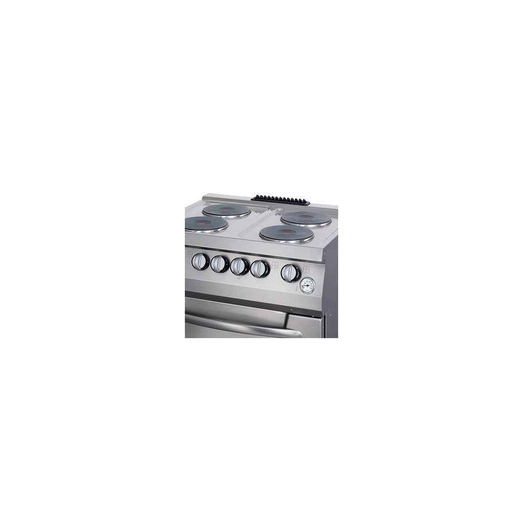 V gastronomickej kuchyni sa denne intenzívne varí, takže kuchynské vybavenie musí byť odolné a vydržať nápor. Tento elektrický sporák má štyri horáky a rúru a je ideálny na použitie s niekoľkými veľkými hrncami a panvicami. Podstavce na panvice sú vyrobené z odolnej liatiny a majú priemer 22 cm. Pretože sú podpery panvíc zabudované do monoblokovej dosky, nezostávajú v zákutiach žiadne zvyšky jedla. Tento profesionálny varič je ideálny na inštaláciu do varnej linky.