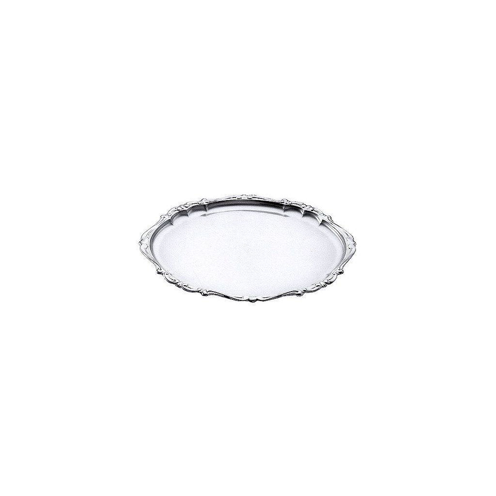 Oválna tácka z leštenej nehrdzavejúcej ocele s dekoračným barokovým okrajom.Dodatočné parametre