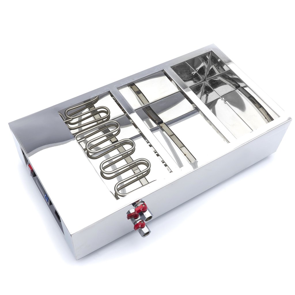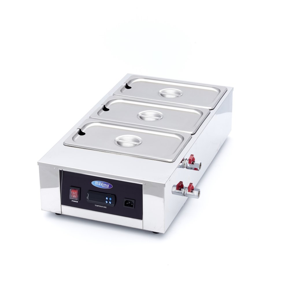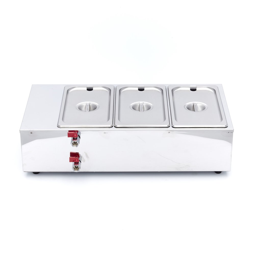 Táto nerezová tavička čokolády je vybavená 3 kusmi nádob 1/3 GN a zodpovedajúcimi viečkami. Má 4 gumové nožičky, ktoré ju udržujú pevne na povrchu. Displej sa ľahko ovláda a skladá sa z tlačidla zapnutia/vypnutia a digitálneho regulátora teploty. Pomocou tlačidiel so šípkami môžete nastaviť požadovanú teplotu a digitálny displej vám umožní sledovať priebeh ohrevu. Teplota je nastaviteľná na jeden stupeň od 3 do 412 °C. Tavič čokolády je vybavený kohútikom, pomocou ktorého môžete tavič čokolády ľahko vyprázdniť. Tavič čokolády má tiež ventil na vypúšťanie pary. Paru vzniknutú ohrevom vody tak možno zo spotrebiča ľahko vypustiť.
