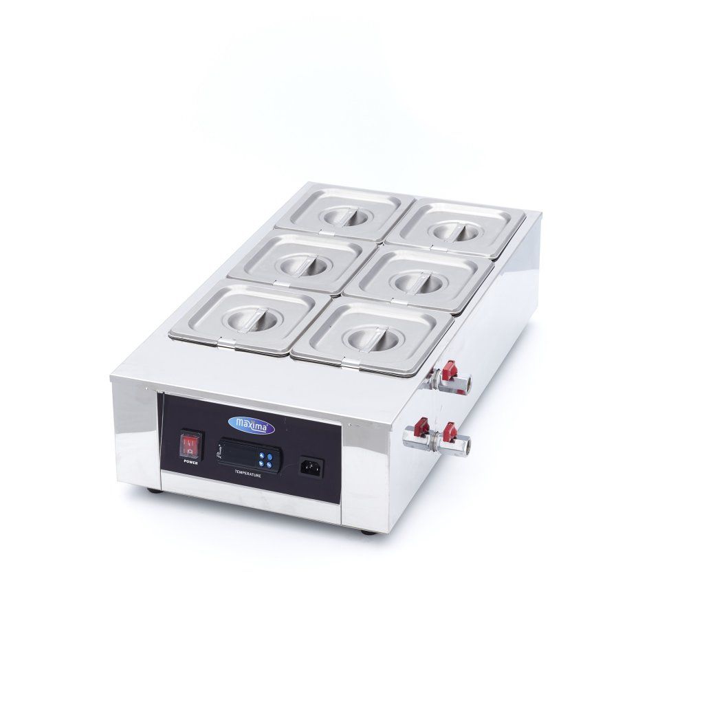 + Stály tok rozpustenej čokolády + Presne nastaviteľná teplota + Zabraňuje pripaľovaniu čokolády - Voda môže spôsobiť zrážanie čokoládyTáto krásna tavička čokolády umožňuje jednoduché rozpúšťanie čokolády. Obsahuje 6 nádobiek s veľkosťou 1/6 GN, hĺbkou 10 cm a zodpovedajúce viečka. Digitálny displej prehľadne zobrazuje, aká horúca je voda a GN nádoby.