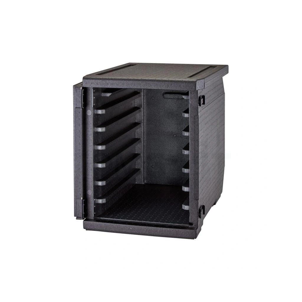 Termobox s predným plnením a 9 koľajnicami renomovaného výrobcu CAMBRO je jedným z najlepších produktov na prepravu pokrmov na trhu. Boxy vynikajú svojou odolnosťou, ľahkosťou a disponujú 9 vstavanými koľajnicami, ktoré nemožno rozšíriť ani vybrať. Koľajnice sú prispôsobené pre plechy 60 × 40 cm a majú medzeru 3,5 cm. Vstavané rukoväte v hornej časti boxu v spojení s plne otvárateľnými dvierkami (270°) zaisťujú jednoduchú manipuláciu aj nakládku a vykládku pokrmov. Termoboxy sú stohovateľné, odolné voči mastnote či chemikáliám a môžete ich umývať v umývačke riadu. Možno ich použiť aj s ohrievacími a chladiacimi vložkami, ktoré sa vkladajú na zadnú stranu boxu, čo zabraňuje odkvapkávaniu kondenzovanej vody na pokrmy a zároveň zaisťuje rovnomerné rozloženie tepla či chladu v celom boxe.Termobox s predným plnením a 9 koľajnicami