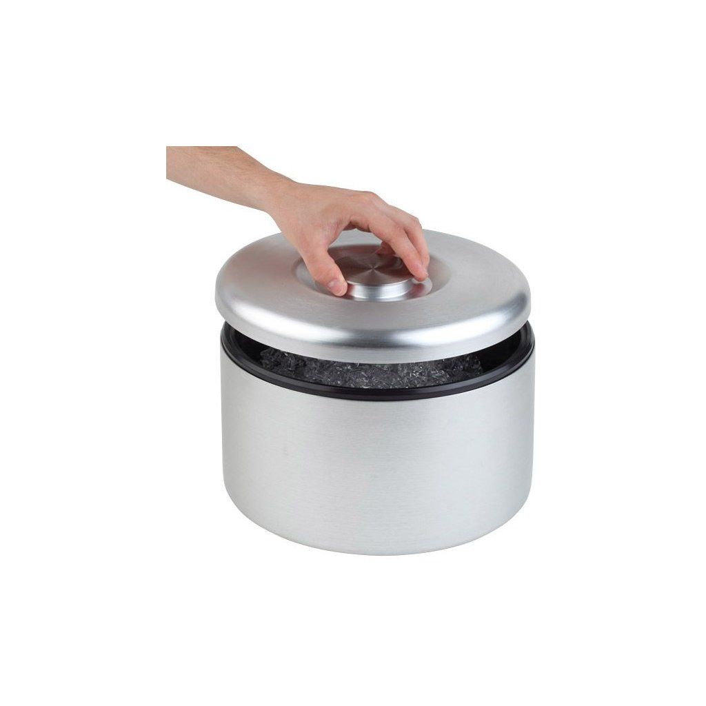 Chladiaca nádoba s vekom na ľad. Vyrobené z eloxovaného hliníka. Vnútorná vložka vyrobená z čierneho polypropylénu. Vhodné do umývačky riadu.