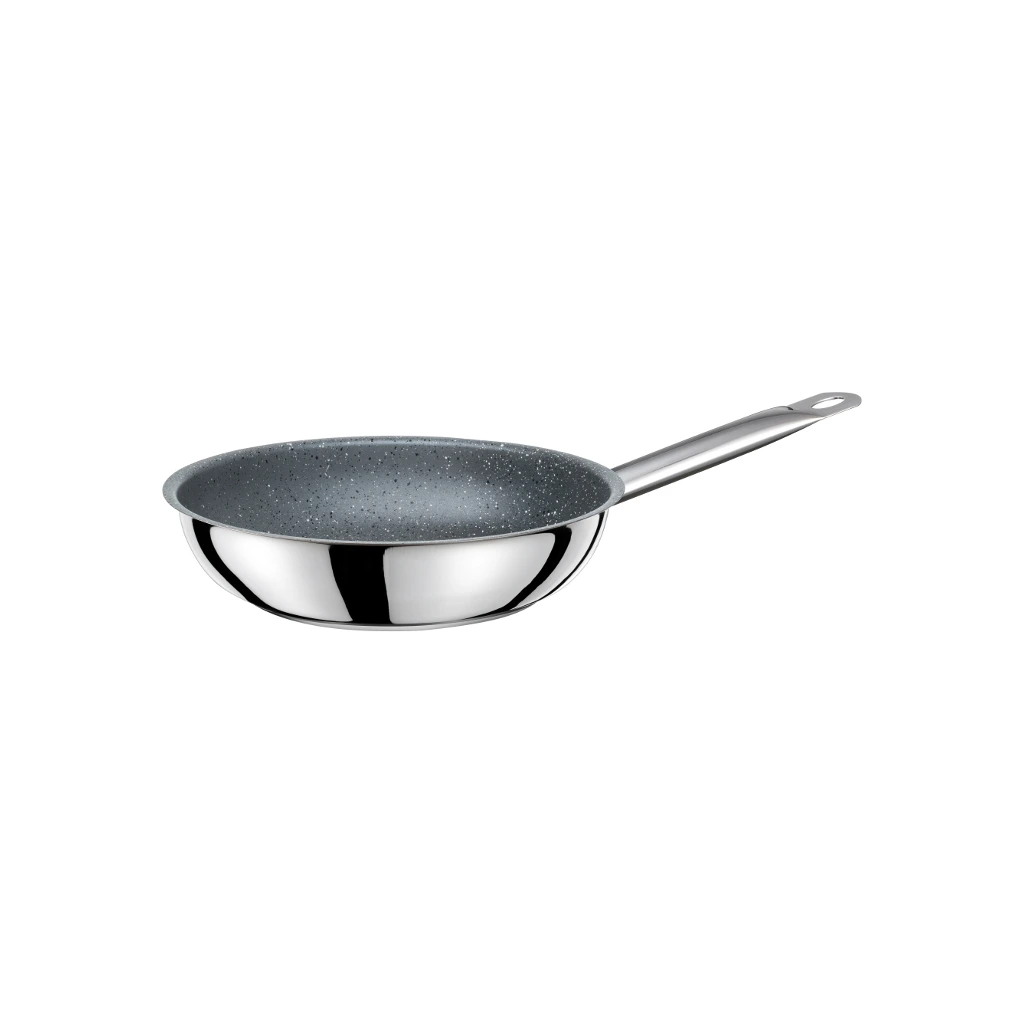 Kvalitná panvica vyrobená z vysoko leštenej nehrdzavejúcej ocele 18/10. Má tlusté, trojvrstvové „sendvičové“ dno, zosilnený nepriľnavý povlak a vnútri mramorovú konštrukciu. Rukoväť je žiaruvzdorná, odvetraná a bez nitov. Hodí sa na smaženie na masle, a to aj na indukcii. Avšak už sa jej tak veľmi nepáči v umývačke riadu.Panvica Granite 32 cm