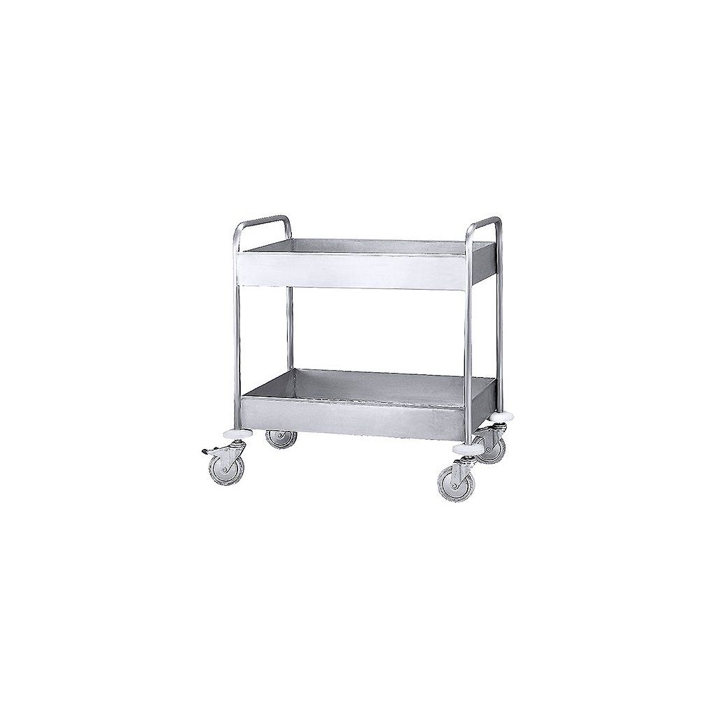 Vozík dvojpolicový s vysokým okrajom vyrobený z nehrdzavejúcej ocele 18/10. Súčasťou sú 4 otáčacie kolieska s priemerom 125 mm, dve z nich s brzdou. Výška okraja 95 mm.Dodatočné parametre