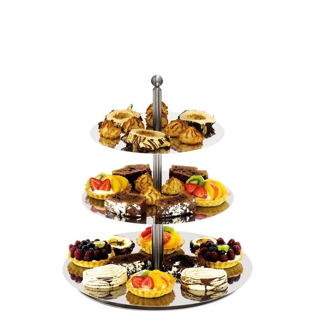 Trojposchodová plošina na tortu z leštenej nehrdzavejúcej ocele. Možnosť akokoľvek poschodovať taniere.