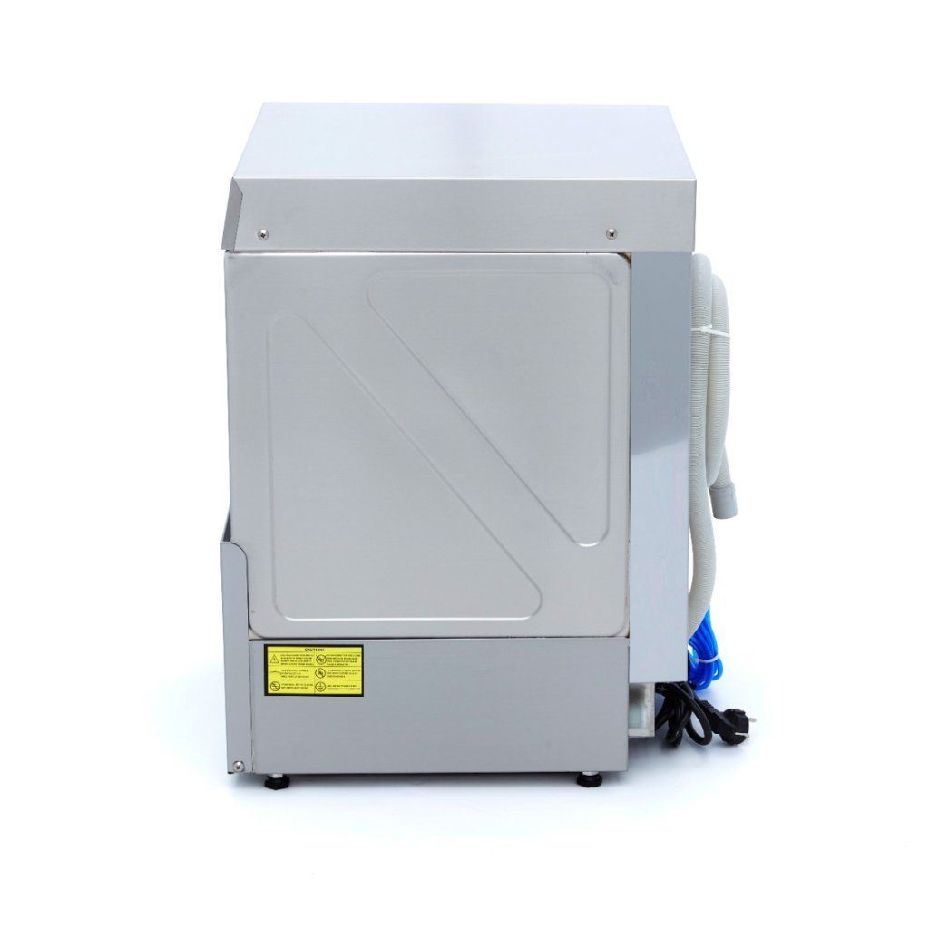 Táto umývačka skla je vysoko ekonomická, spotrebuje iba 2,5 l vody na cyklus. Ponúka bezpečnostné funkcie, ako je tepelná ochrana a ochrana IPX5 pre ovládací panel. Stroj sa tiež ľahko ovláda pomocou jediného tlačidla na plnenie vody a ohrievanie v nádrži bojlera. Digitálny tlakový spínač pre umývaciu nádrž umožňuje jednoduché nastavenie hladiny vody, zatiaľ čo snímač NTC riadi termostat. Poháre sa umývajú pri teplote 55 – 60 °C a oplachujú pri teplote 80 – 85 °C, čo vedie k rýchlejšiemu sušeniu. Môžete si vybrať predhriatie vody alebo začať so studeným umývaním. Štyri kontrolky zobrazujú stav plnenia, ohrievania, umývania a trvania programu. Umývačka skla vydá zvuk po dokončení cyklu. Dodáva sa s košom na sklo s rozmermi 35 x 35 cm, vložkou do stojana na taniere, košom na príbory a prívodnou a vypúšťacou hadicou na pripojenie k prívodu vody. Umývačka riadu obsahuje aj oplachovacie čerpadlo. Štyri nastaviteľné nožičky umožňujú jednoduché prispôsobenie výšky.