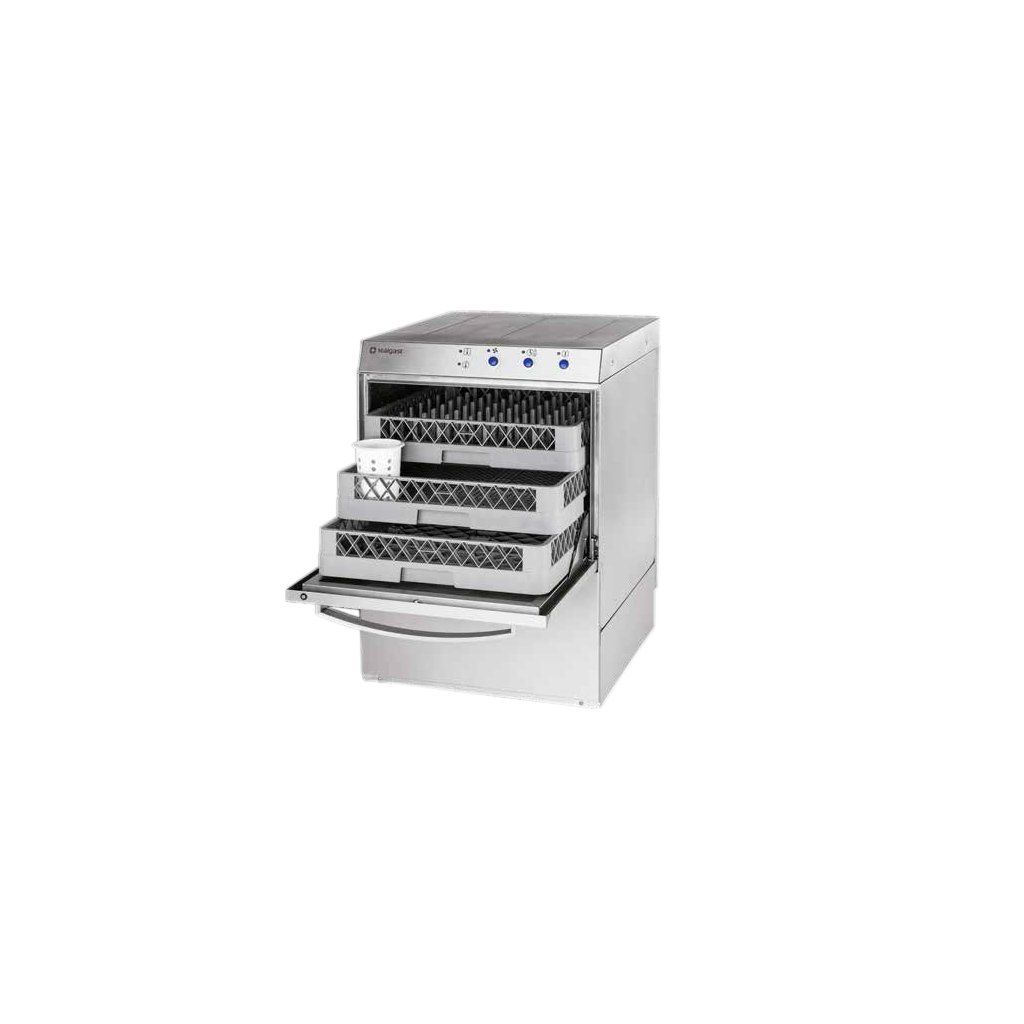 Profesionálna umývačka na sklo a taniere. Dávkovač leštiaceho prostriedku je súčasťou, Bez vypúšťacieho čerpadla. Má funkciu vyparovania, elektromechanické ovládanie. Možnosť umývania tácok GN 1/1.Doplnkové informácie: - profesionálna umývačka s funkciou vyparovania - elektromechanické ovládanie- umývačka prispôsobená na umývanie tácok GN 1/1 - dĺžka cyklu 120/180 sek.- pracovné kontrolky bojlera a komory - 2 páry umývacích a oplachových ramien (horná a spodná strana) - spotreba vody 2,5 l/cyklus - maximálna výška umývaného riadu 320 mm - kôš 500x500 mm - v sade kôš na taniere, univerzálny kôš, kôš na sklo a nádobka na príbory - možnosť použitia povrchového filtra 801990 - zariadenie má mať namontovaný zmäkčovač vody pre jeho ochranu - Stalgast profesionálne umývacie prostriedky zaručujú lepší výkon umývačkyDodatočné parametre