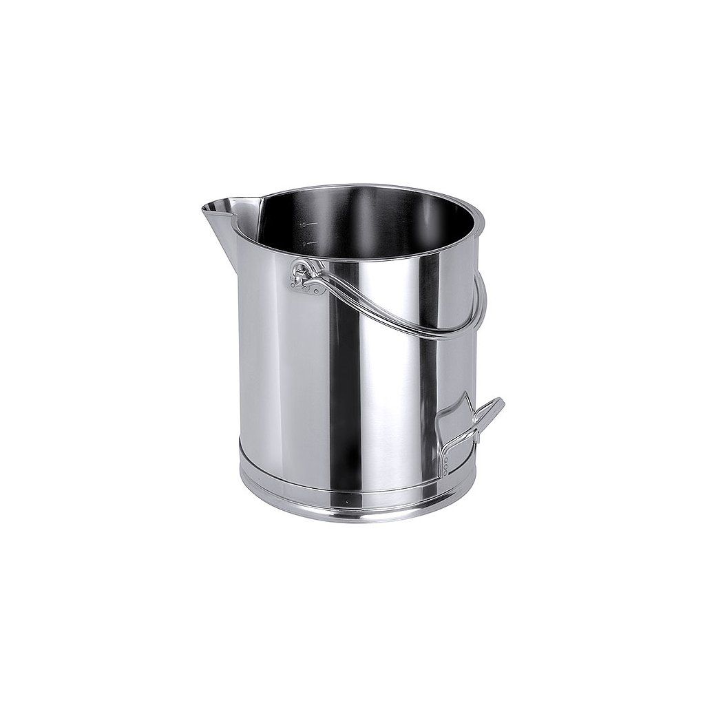 Vedro 20 l zo saténovej nehrdzavejúcej ocele s výlevkou, jedným pohyblivým a jedným pomocným úchytom a vnútorným cejchovaním.