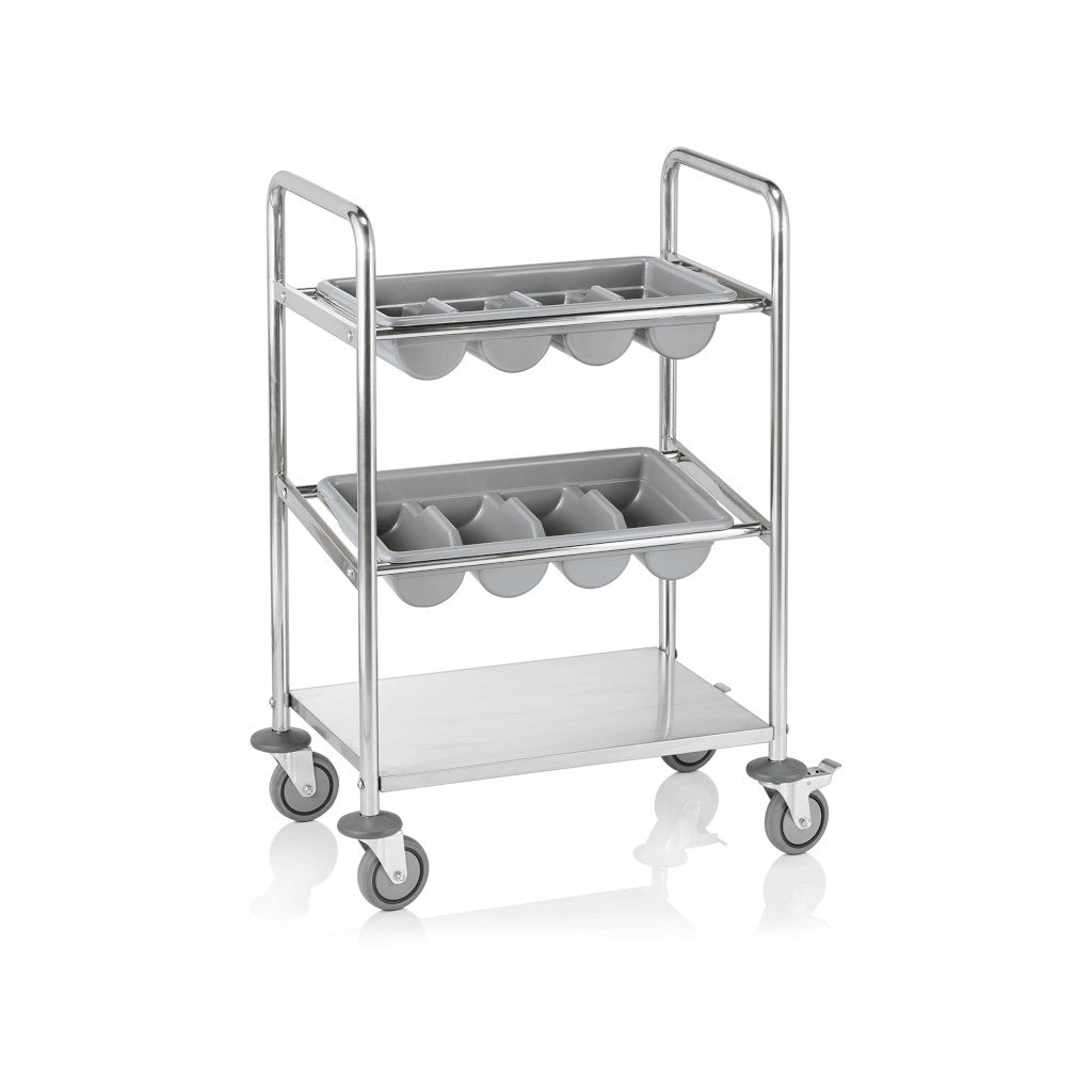 Praktický vozík s 2 odkladacími policami na príbory a 1 podstavcom sa skvele hodí do všetkých gastro podnikov aj hotelov. Disponuje 4 otočnými kolieskami s ochranou proti hrkotaniu, z toho 2 sú s brzdou.