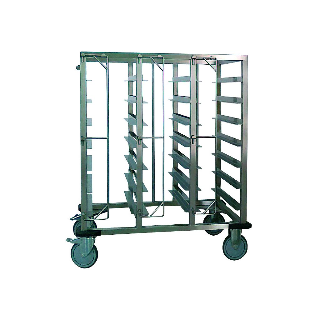 Jednoduchý vozík na transport tabletov Thermoline 510x255. Vyrobený z chrómniklovej ocele 18/10bez opláštenia, bodované lišty, zatváranie vozíka jednoduchými dvierkami na zarážku, rúrkové madlo na krátkej strane vozíka, rohové nárazníky, 2 otočné kolieska s brzdou s priemerom 150 mm, 2 pevné kolieska, rozmery (mm): 945x595x1125, kapacita: 21, hmotnosť (kg): 42Buďte prvý, kto napíše príspevok k tejto položke.