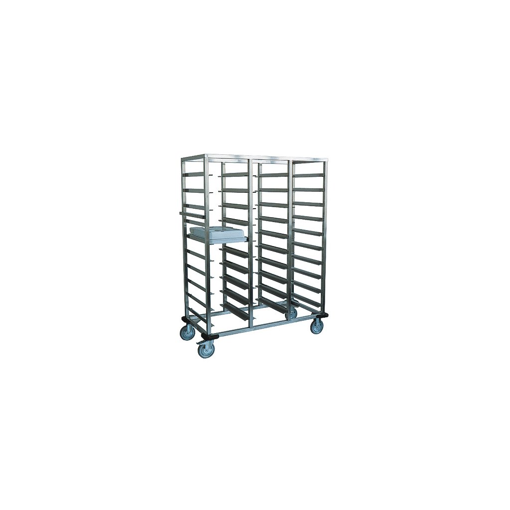 Prepravný etažérový vozík typu NET - 3/30 - na tablety vyrobený z chrómniklovej ocele 18/10.Slúži najmä na transport a skladovanie riadu v košíkoch, tabletov a ich častí, popr. jedál v GN. Rozmery (mm): 1305×620×1695Rozmery tabletu (mm): 530x370Kolieska priemer. 150 mm: 2 pevné, 1 otočné, 1 otočné s brzdouKapacita tabletov (ks): 30Hmotnosť (kg): 58Nosnosť jednotlivých líšt/ polí (kg): 20Buďte prvý, kto napíše príspevok k tejto položke.